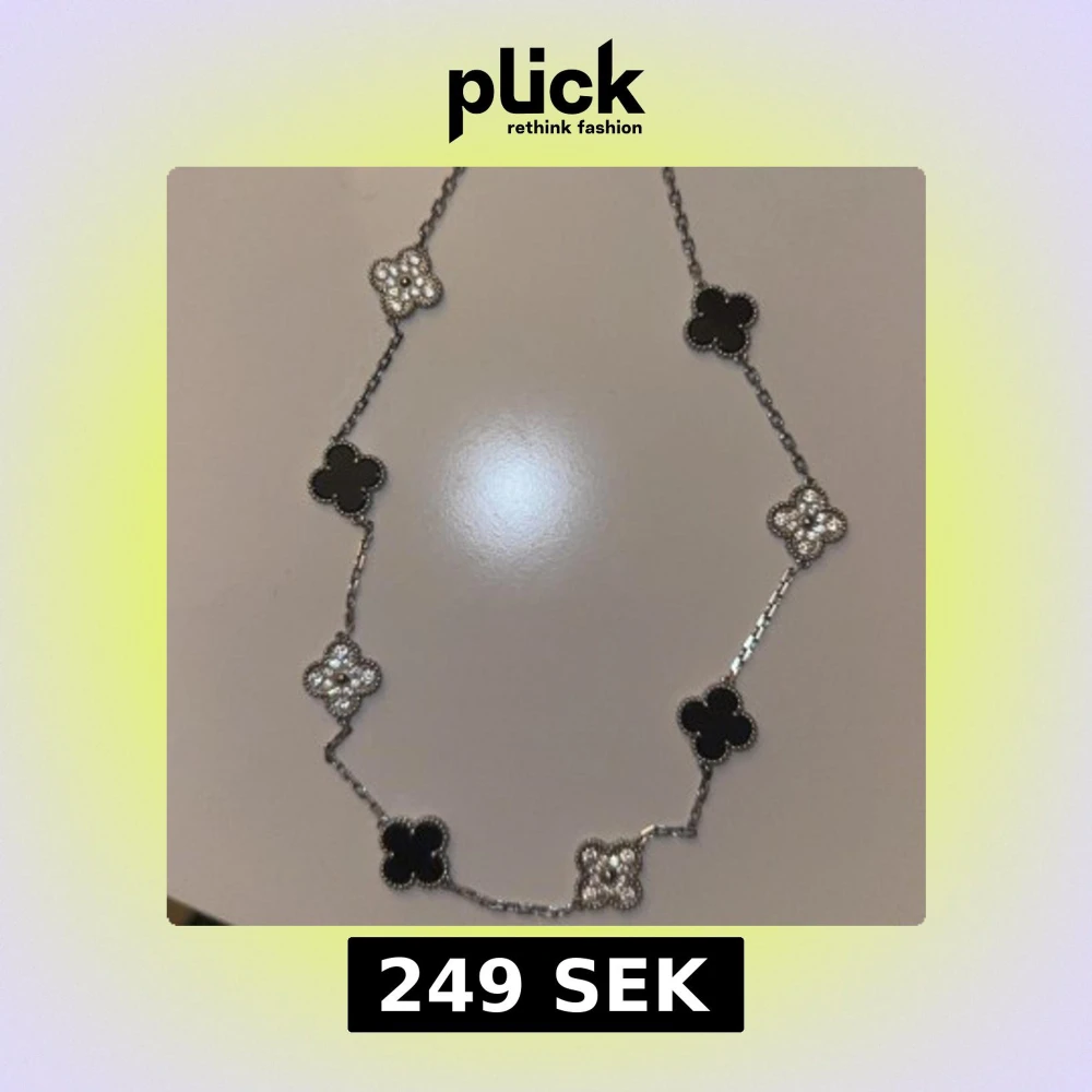 Stilrent halsband i silverfärg med växelvis svarta och glittriga fyrklöverformade hängen. Kedjan är tunn och elegant, och klöverhänget har en fin pärlad kant. Perfekt accessoar för att lyfta din outfit med en touch av lyx.