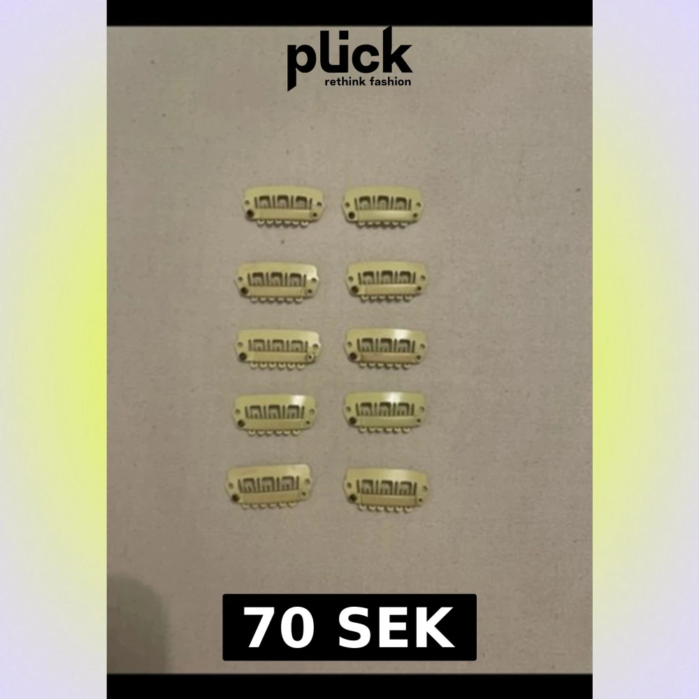 Säljer ett set med 10 stycken små hårclips i guldig färg. Clipsen är rektangulära med rundade kanter och har små öglor för att fästa hårslingor. Perfekt för att skapa snygga frisyrer eller fästa löshår. Metallmaterial och stilren design.