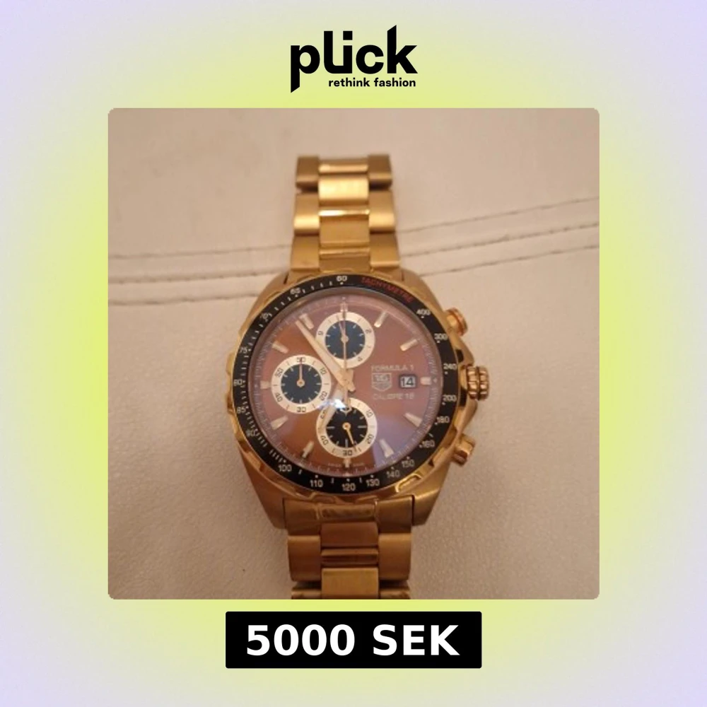 Säljer en TAG Heuer Formula 1 Calibre 16 kronograf med guldigt armband och boett. Klockan har en rund urtavla med svarta och vita detaljer, datumvisning och tachymeter på ringen. Robust design i metall med snygga tryckknappar på sidan. Nytt batteri behövs