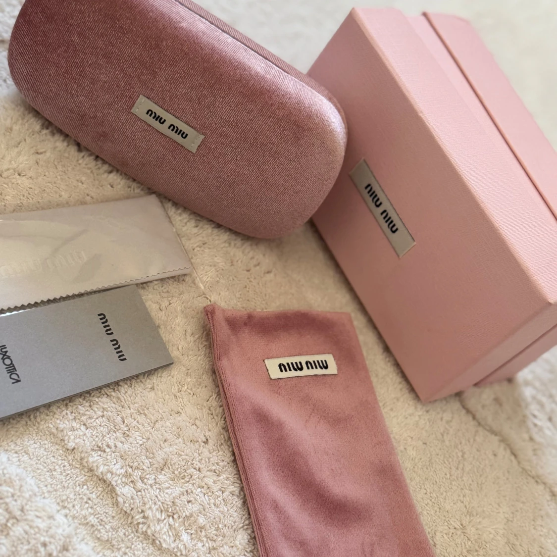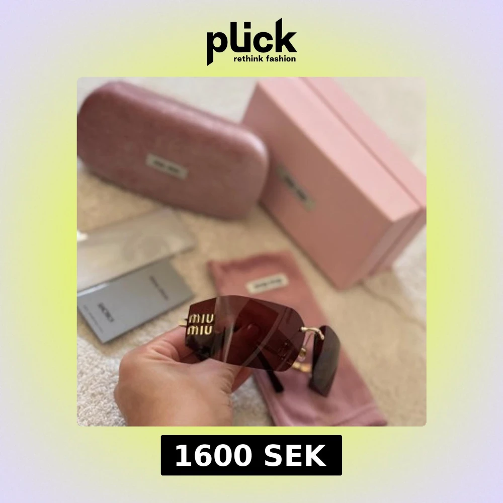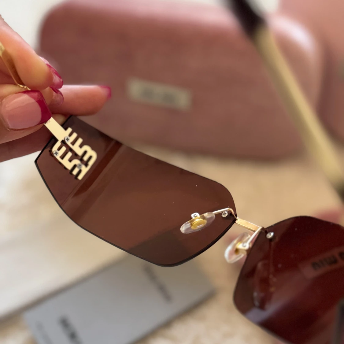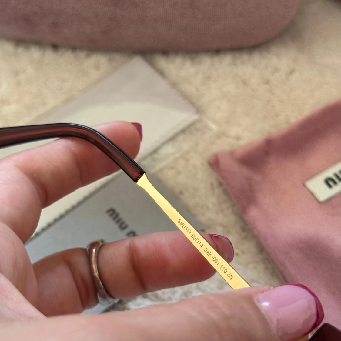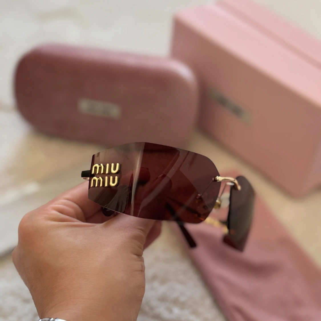Snygga solglasögon från Miu Miu med stora, rektangulära bruna linser och guldiga detaljer. Glasögonen har en modern shield-design och tydlig Miu Miu-logga i guld på sidan. Bågarna är i en mix av brunt och guldigt material. Kommer med originalfodral och ask.