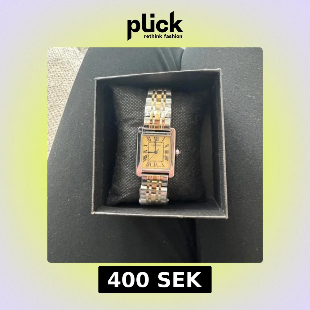 Säljer en stilren klocka med rektangulär guldfärgad urtavla och romerska siffror. Armbandet är i tvåtonad metall, både guld och silver. Perfekt accessoar för dig som gillar klassisk design.