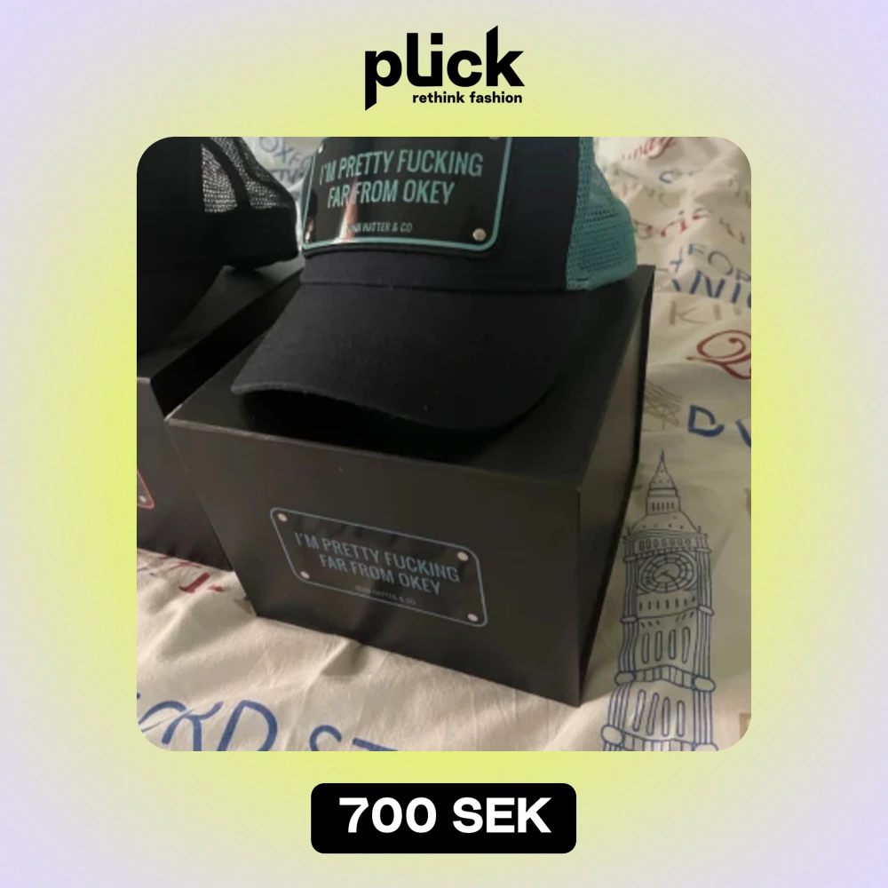 keps från John Hatter & Co med metallskylt - Cool keps från John Hatter & Co med svart mesh på sidorna och en stor svart metallskylt framtill med röd text. Justerbar passform bak. Perfekt statement-accessoar för dig som vill sticka ut. Köpt från deras hemsida för 1000, box kommer med