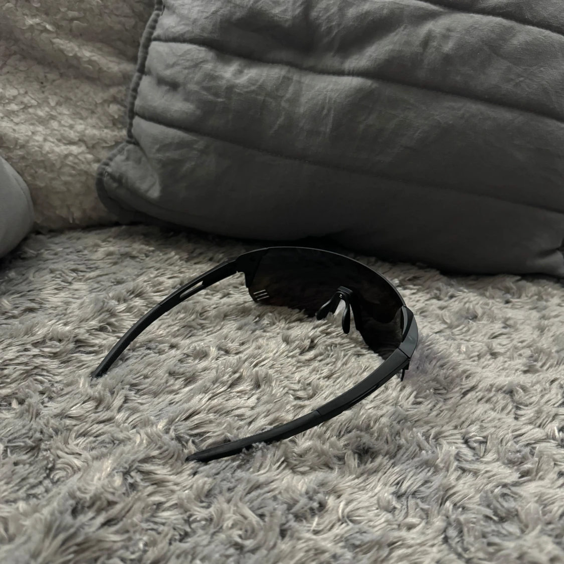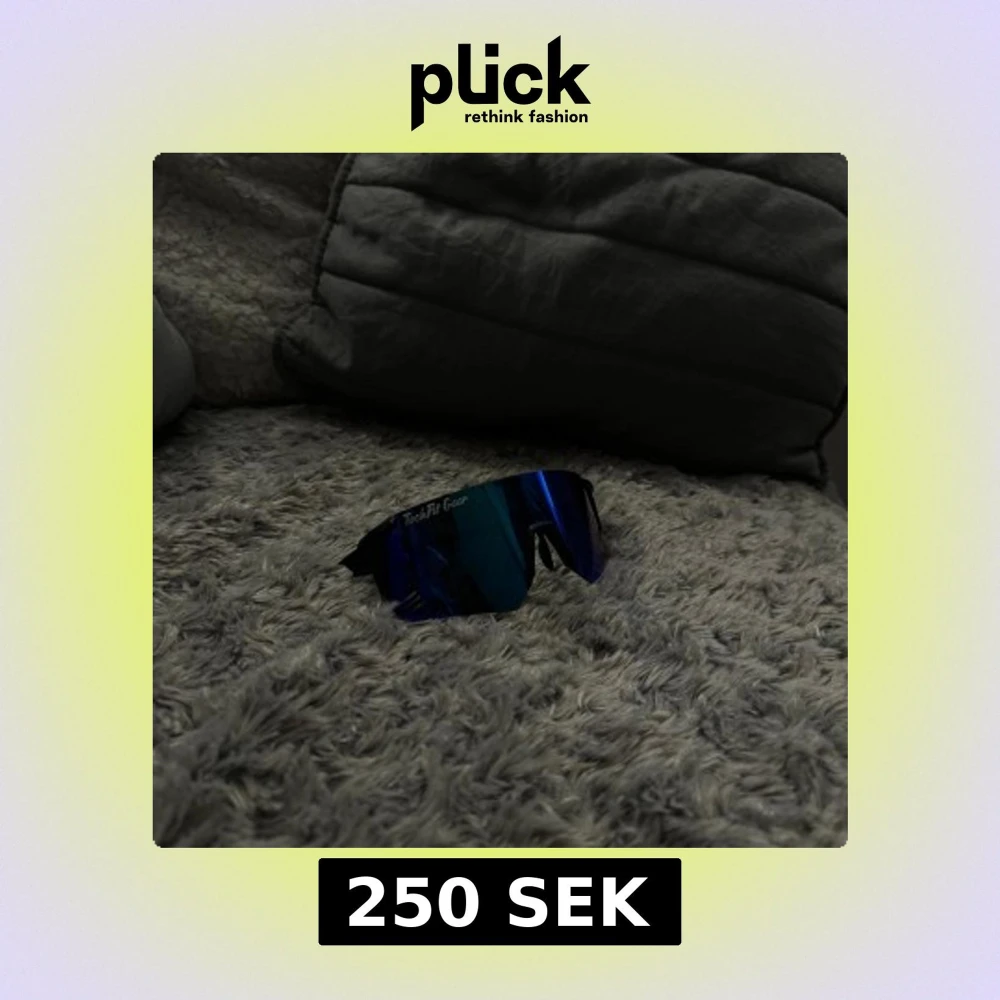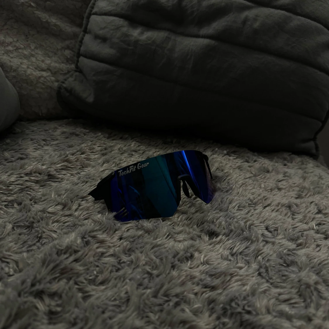 Snygga och sportiga solglasögon från TechFit Gear med svarta bågar och blå spegelglas. Perfekta för en aktiv livsstil och skyddar mot solen med stil.