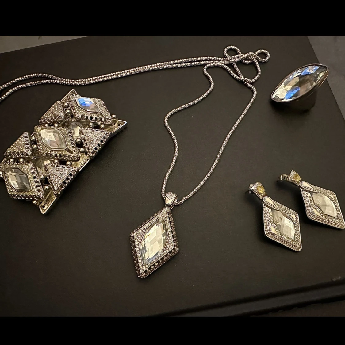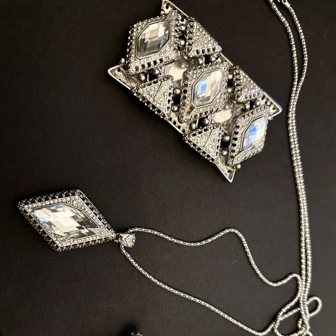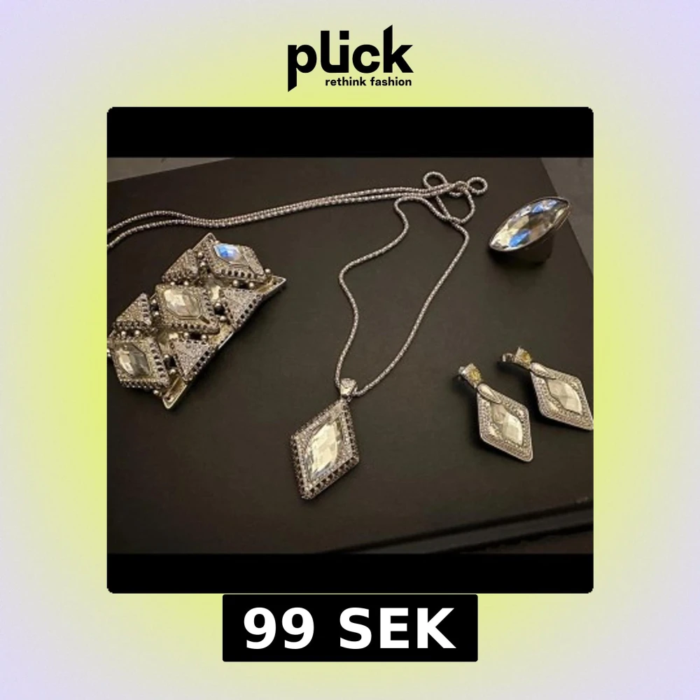 Säljer ett komplett set med halsband, armband, ring och örhängen i silverfärg med stora, slipade kristaller. Alla delar har en cool geometrisk design med rektangulära och diamantformade detaljer, perfekt för dig som gillar statement-smycken.