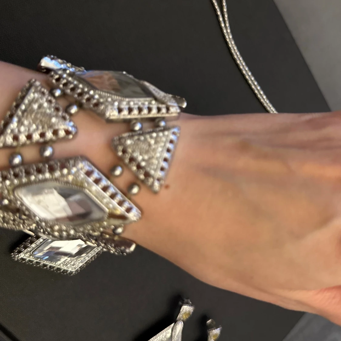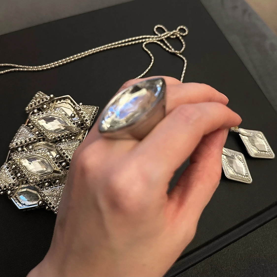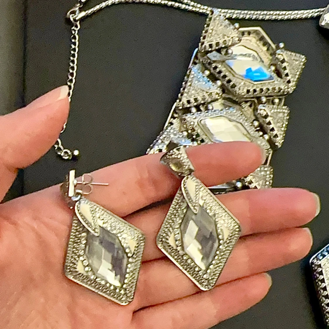 Säljer ett komplett set med halsband, armband, ring och örhängen i silverfärg med stora, slipade kristaller. Alla delar har en cool geometrisk design med rektangulära och diamantformade detaljer, perfekt för dig som gillar statement-smycken.