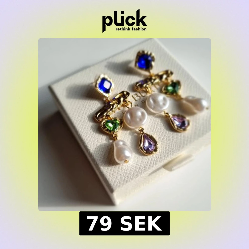 Unika örhängen med blå, gröna och lila stenar i olika former, samt vita pärlor. Guldpläterade detaljer och hängande design ger ett lyxigt och kreativt uttryck. Perfekt för dig som gillar färg och statement-smycken. Lådan ingår ej.