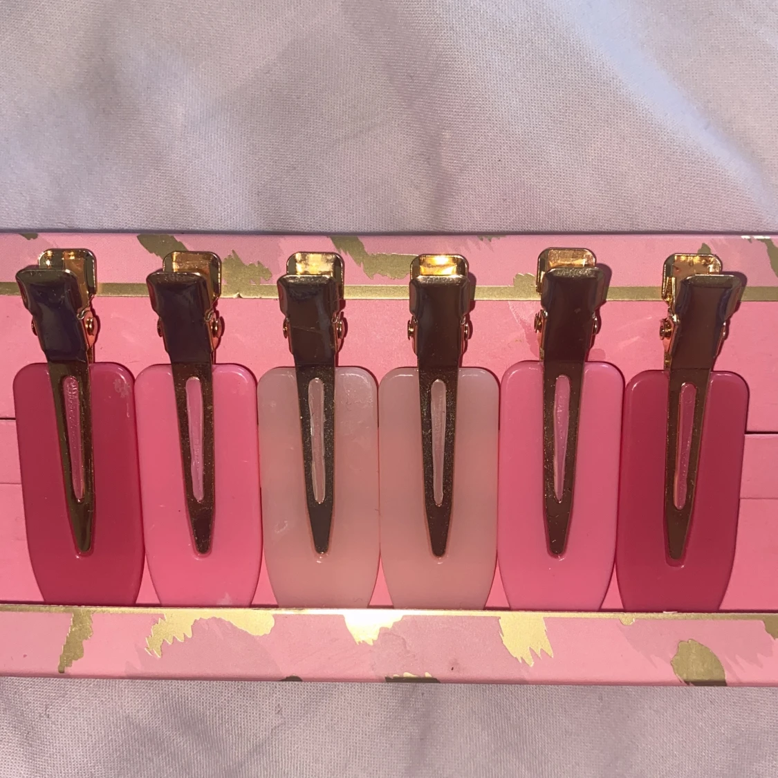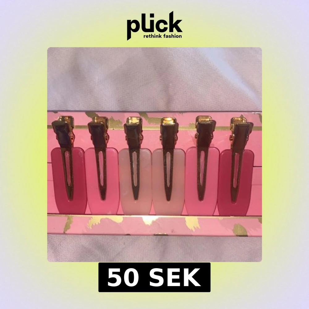 Säljer ett set med sex hårklämmor i olika rosa nyanser, från ljusrosa till mörkrosa. Klämmorna har en stilren, rektangulär form och detaljer i guldmetall. Perfekta för att piffa upp frisyren och hålla håret på plats! ❤️