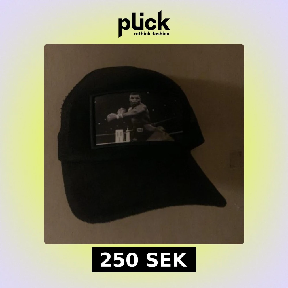 Säljer en svart keps med mesh på sidorna och ett stort tryck framtill som visar en boxare i ringen. Skärmen är böjd och kepsen har klassisk trucker-stil. Perfekt för dig som gillar sportiga och coola accessoarer.