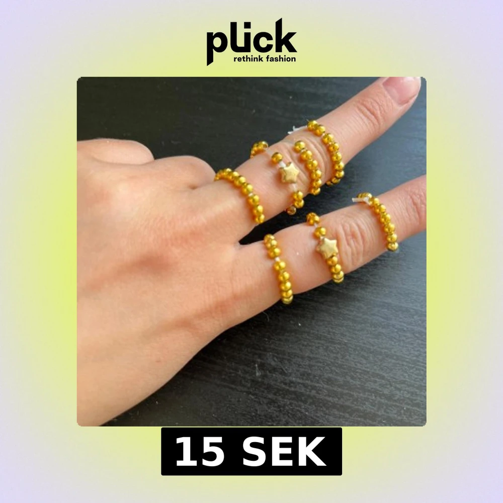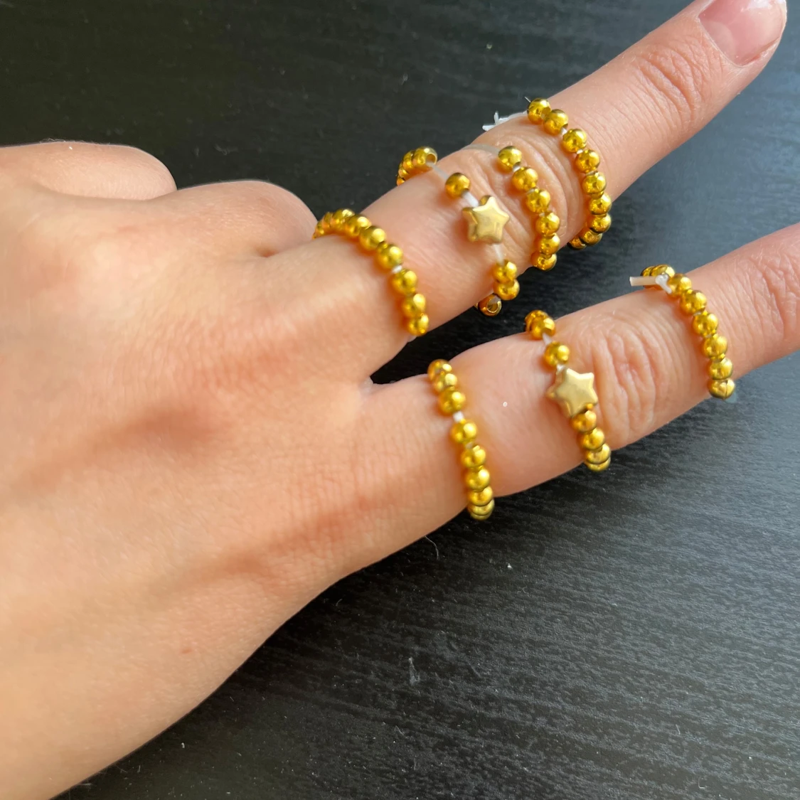 SĂ€ljer flera handgjorda ringar med smĂ„ guldfĂ€rgade pĂ€rlor och söta stjĂ€rndetaljer. Perfekta för att mixa och matcha pĂ„ olika fingrar för en trendig look. Passar dig som gillar unika accessoarer med lite extra bling.đ