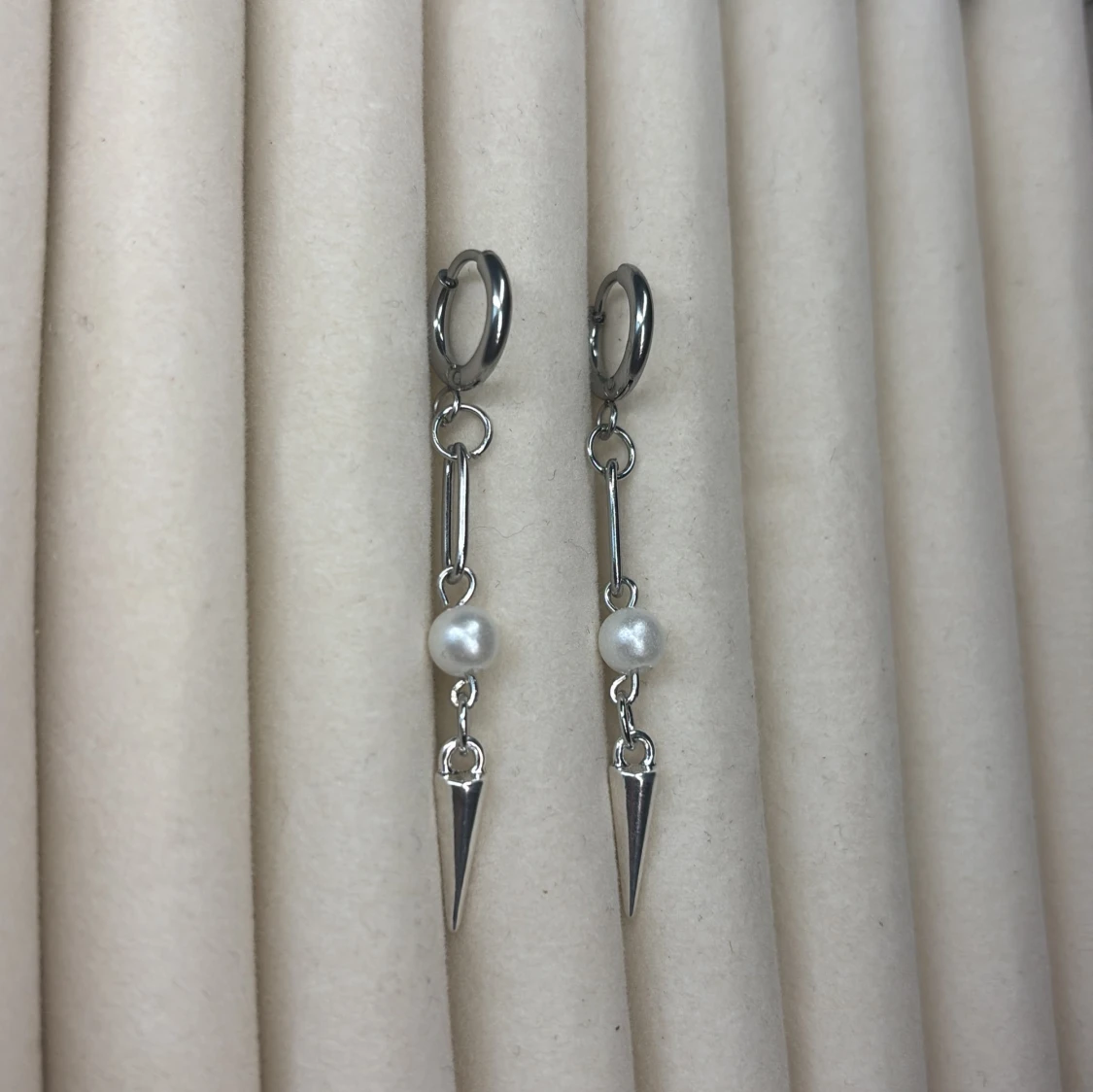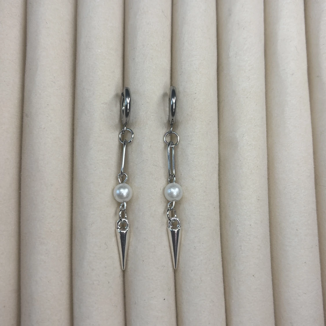 Silverfärgade örhängen med pärldetalj och spetsig hängande berlock