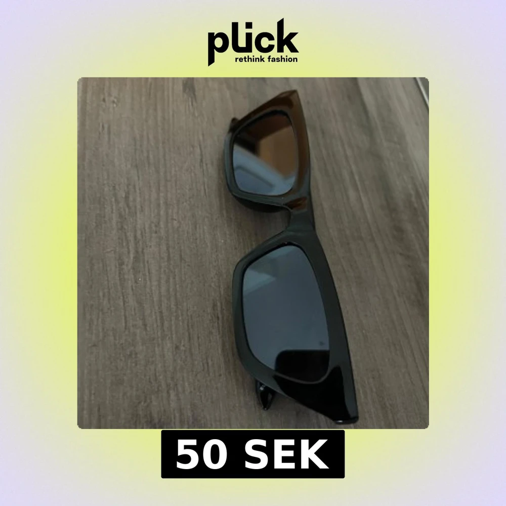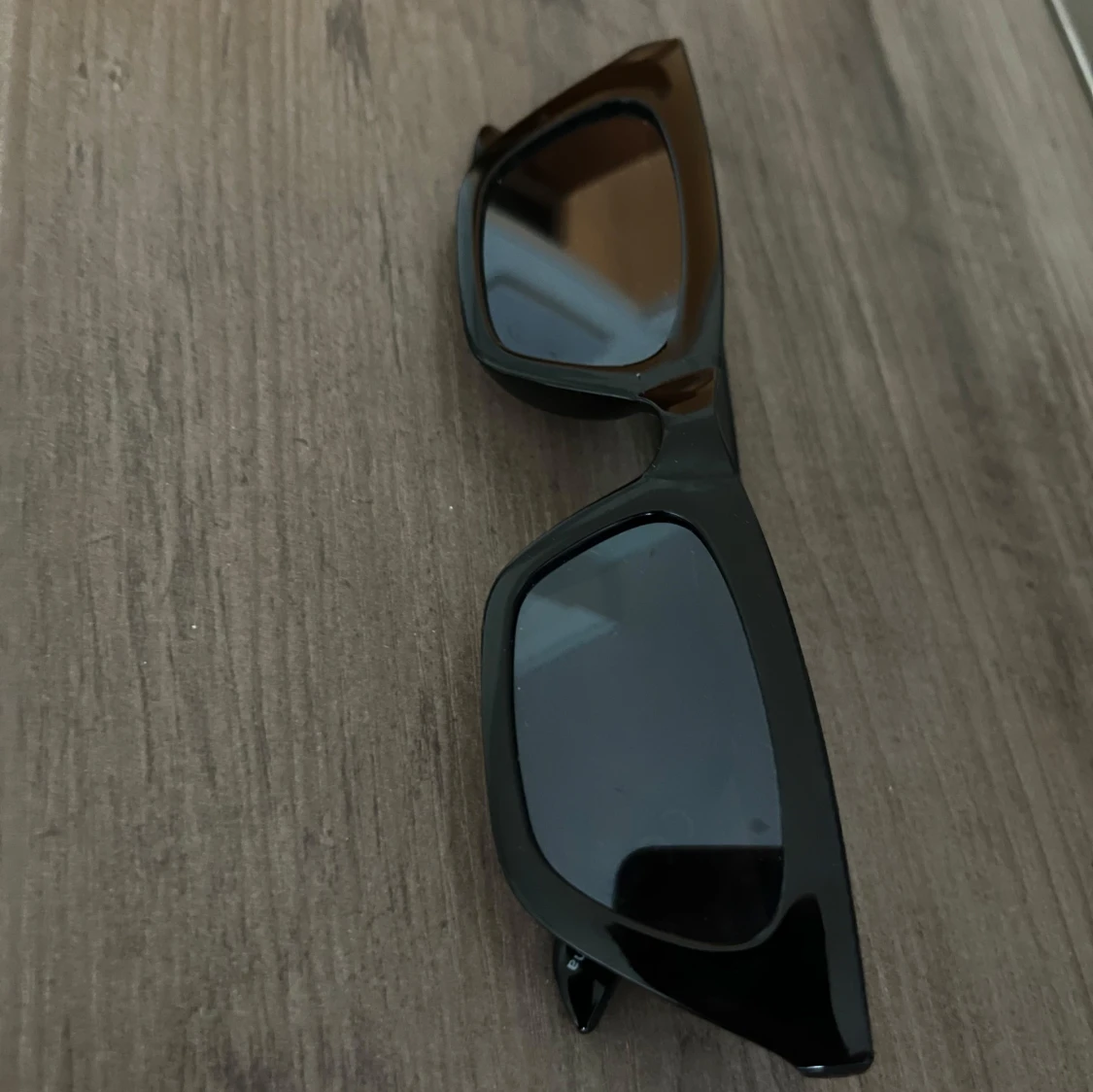 Snygga svarta solglasögon med breda, kantiga bågar och mörka glas. Aldrig använda