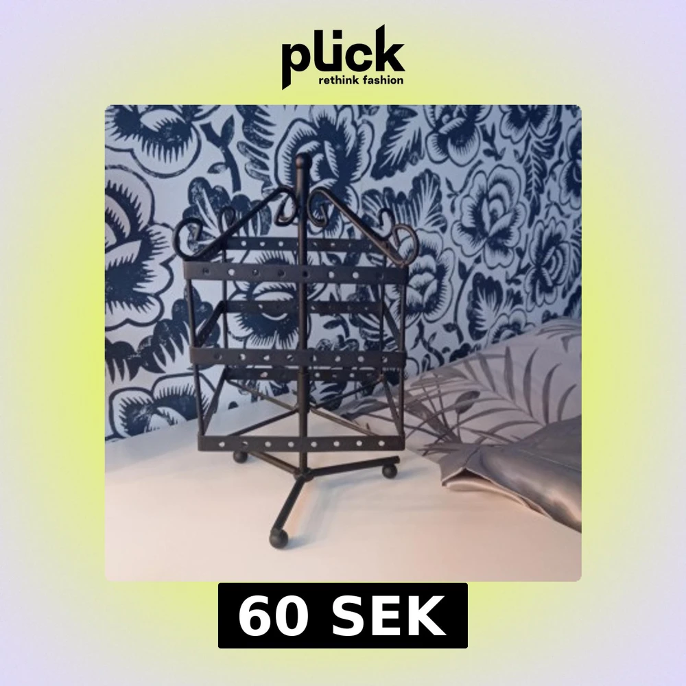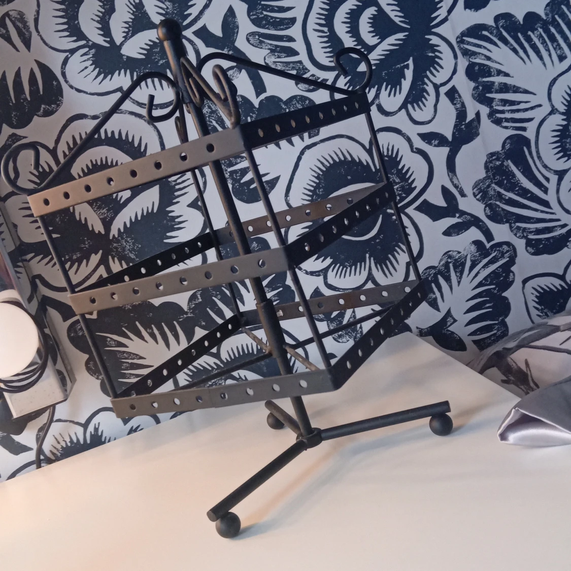 Snygg svart smyckeshållare i metall med tre våningar och många hål för att hänga örhängen. Står stadigt på tre ben och har dekorativa detaljer upptill. Perfekt för att organisera och visa upp dina smycken på ett stilrent sätt. Om priset är för högt är det bara att skicka ett bud.