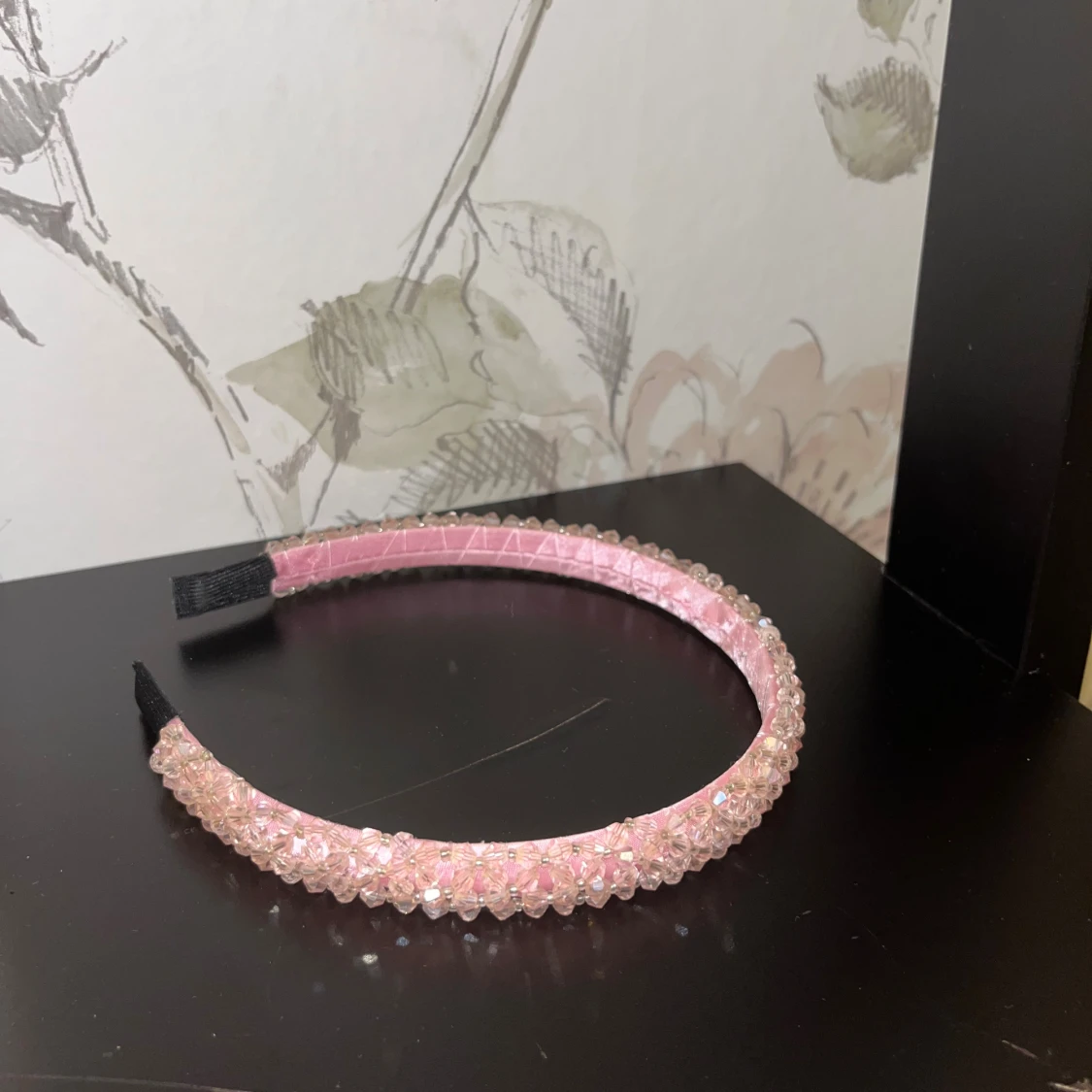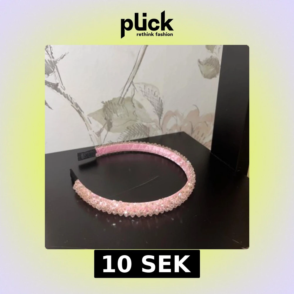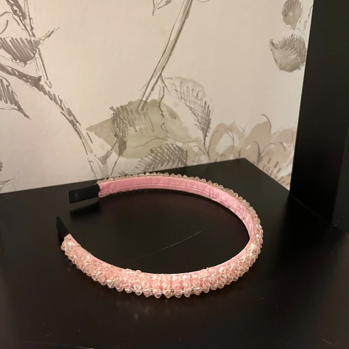 Snyggt rosa diadem dekorerat med glittriga pärlor som ger en extra touch till din look. Diademet har en mjuk satinliknande yta och pärlorna är transparenta med rosa ton. Perfekt för att lyfta din frisyr och ge lite glam.