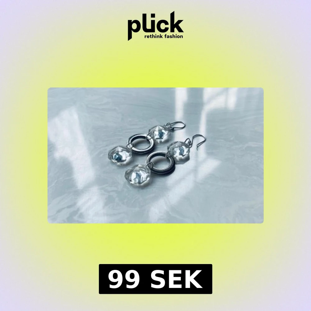 Säljer ett par unika örhängen med stora, facetterade kristallpärlor och en rund silverfärgad metallring i mitten. Örhängena har krokar i metall och ger en cool, glittrig look som verkligen sticker ut. Stål