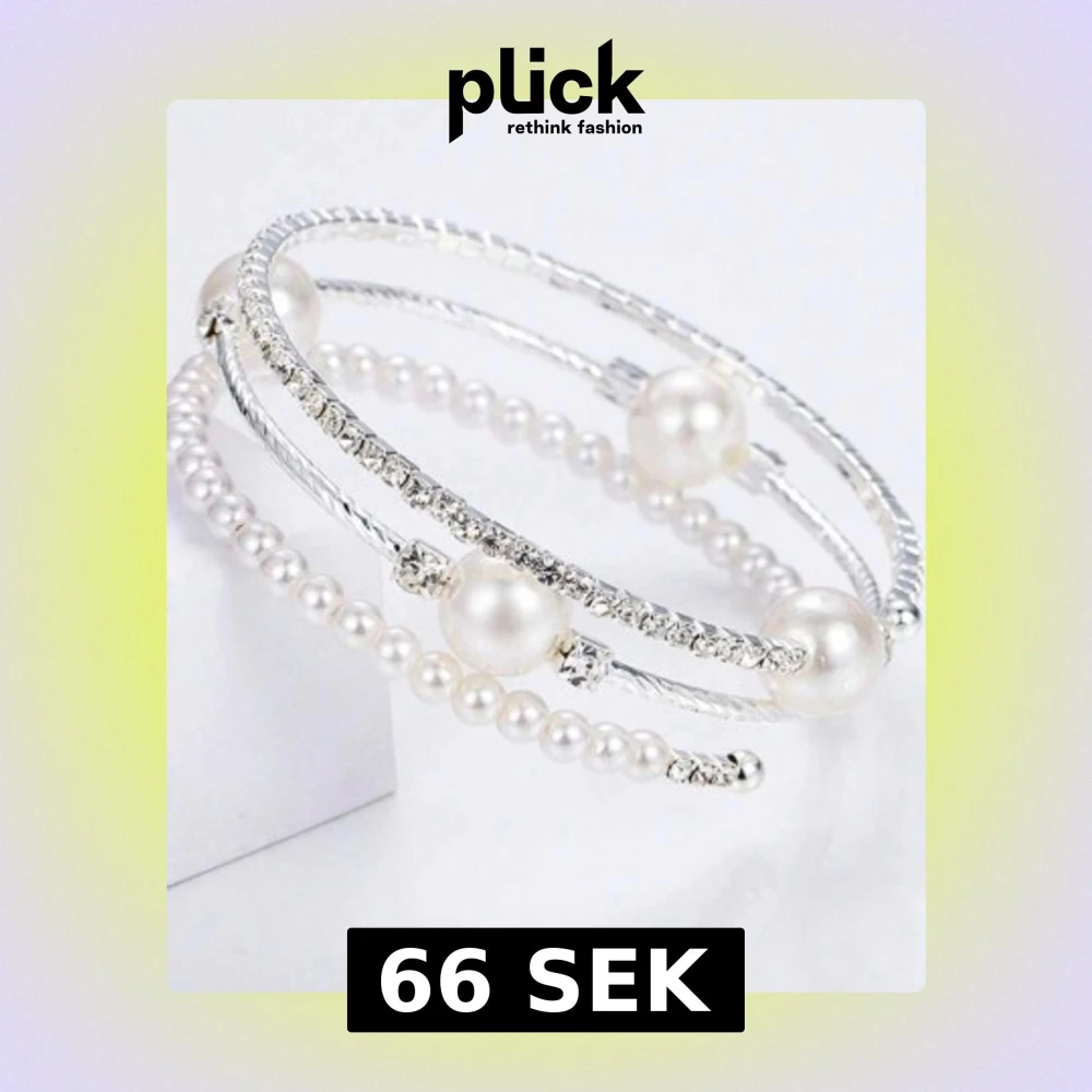 Stilrent armband i silverfärg med flera rader, dekorerat med vita pärlor och gnistrande strass. Armbandet har en spiralform som gör det lätt att ta på och av. Perfekt för dig som gillar en elegant och trendig look.