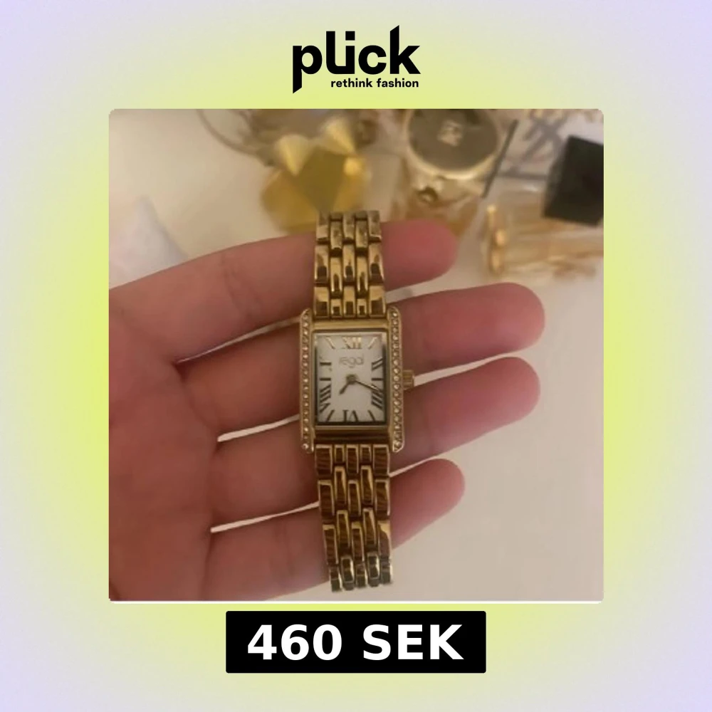 Snygg guldig klocka från Regal med rektangulärt ur och romerska siffror på vit urtavla. Länken är i metall och boetten är dekorerad med små gnistrande stenar längs kanterna. Perfekt accessoar för att lyfta din stil.