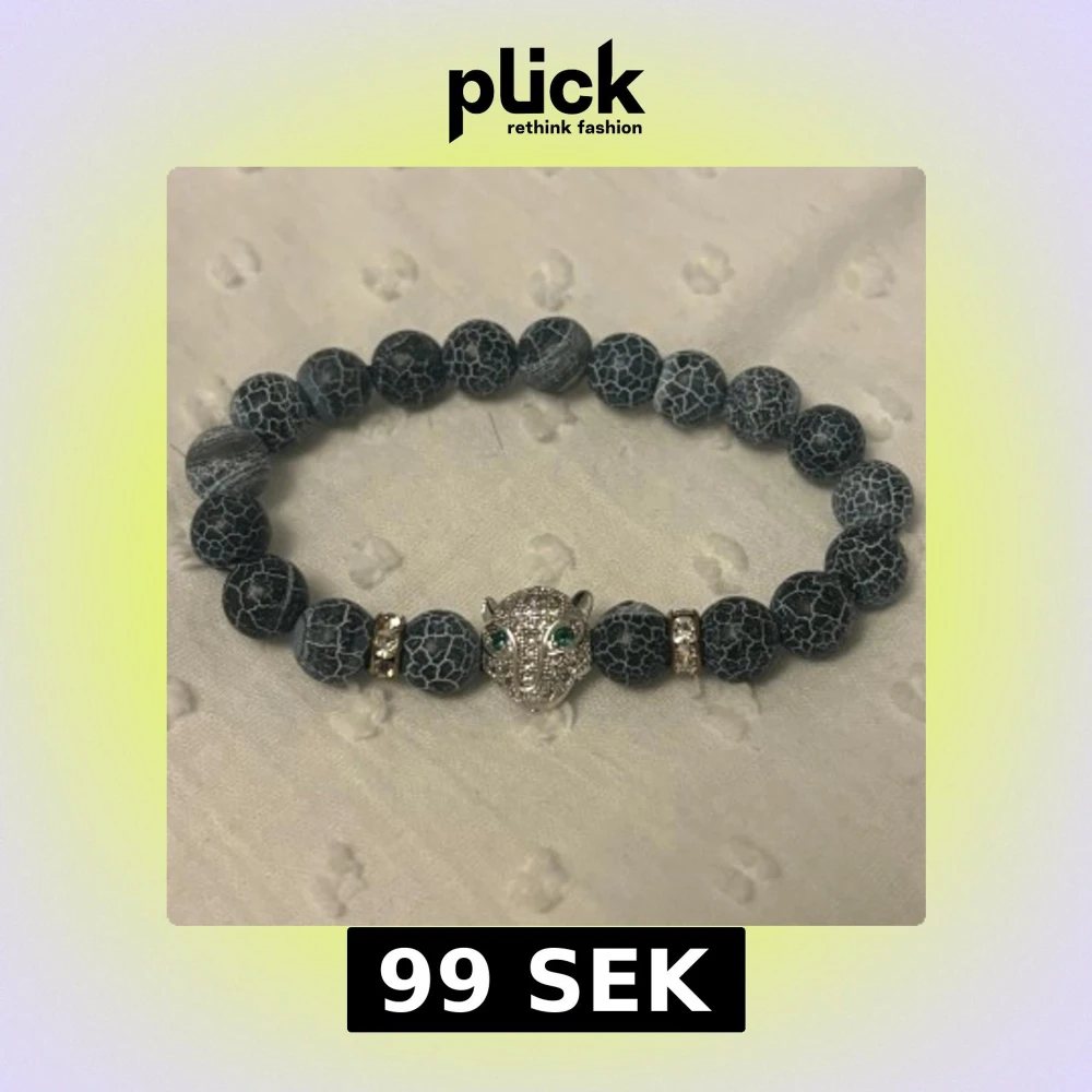 Coolt armband med svarta pärlor och ett glittrigt leopardhuvud i silver med gröna ögon. Mellan pärlorna sitter små detaljer med strass. Perfekt accessoar för att sticka ut lite extra.