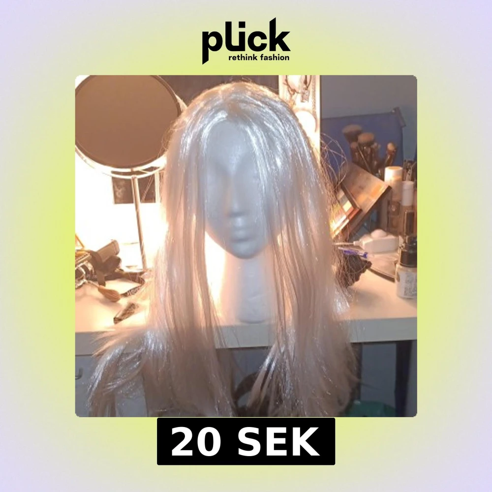 Säljer en lång, rak peruk i vit färg med mittbena. Perfekt för att skapa en unik look till fest eller cosplay. Peruken har glansigt syntetiskt hår men den är från dollarstore så dålig kavlite