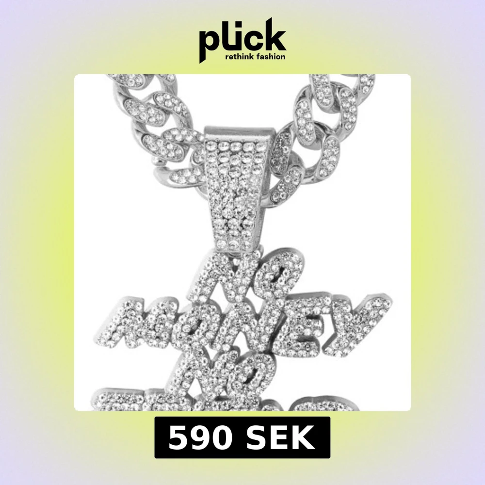 Stilrent och glittrigt halsband i silverfärg med en stor textberlock som säger 'No Money No Friend'. Kedjan är bred och täckt med gnistrande stenar för en extra lyxig känsla.