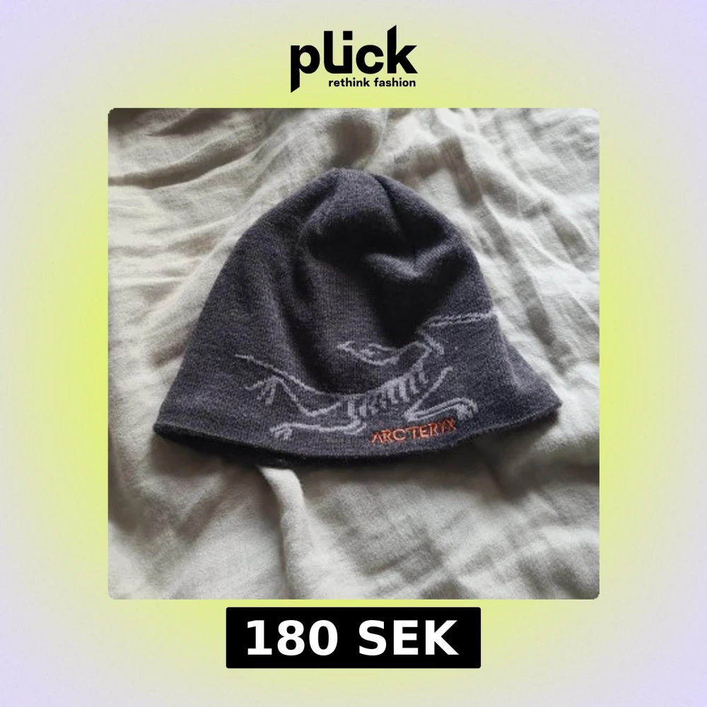 Snygg grå mössa från Arc'teryx med ett coolt mönster och orange broderad logga. Perfekt för kyliga dagar.