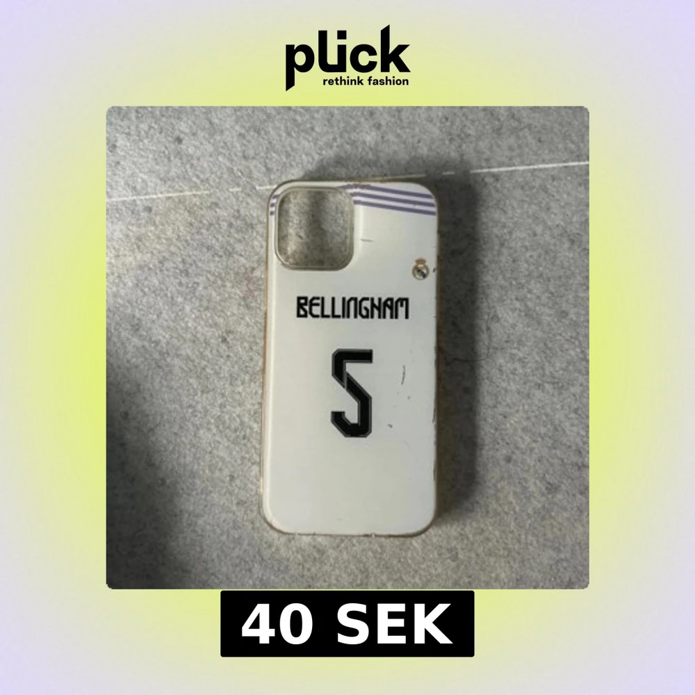 Säljer ett vitt mobilskal med Bellingham-tryck och nummer 5. Skalet har en transparent kant och är designat för att passa en smartphone med en stor kameraöppning. Perfekt för fotbollsfans som vill visa sitt stöd.