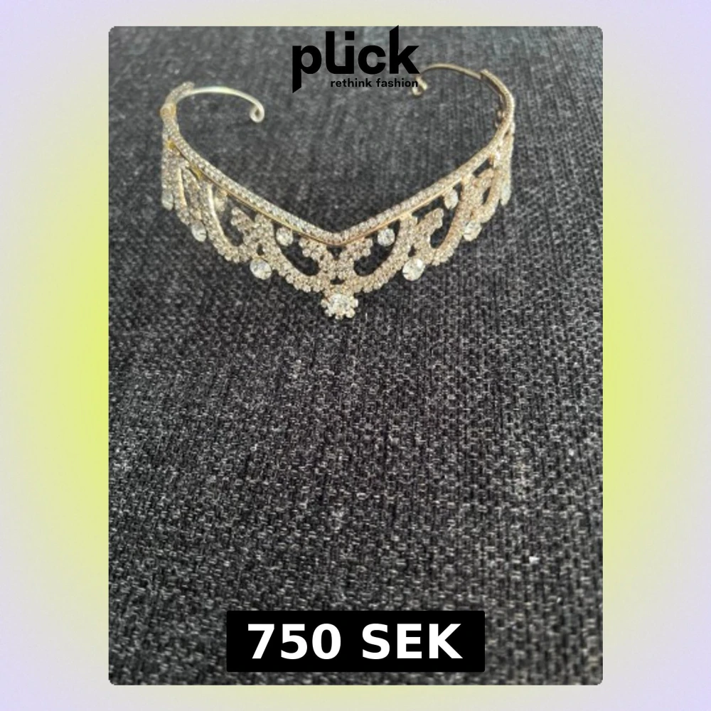 Säljer en glittrig tiara i guld med massor av gnistrande stenar och detaljerad design. Perfekt accessoar för att känna sig extra glam på speciella tillfällen. Tiaran har en klassisk form med blommönster och stora, glittrande stenar som fångar ljuset.