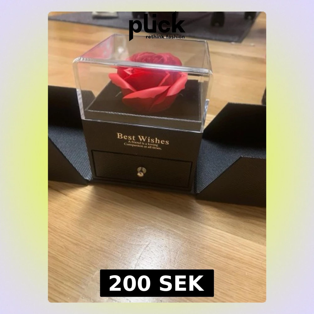 Snygg svart smyckesask med en konstgjord röd ros i genomskinligt lock. Asken har en utdragbar låda för smycken och texten 'Best Wishes' på framsidan. Perfekt för att förvara ringar, halsband eller örhängen.