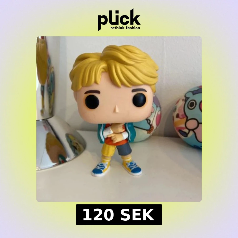 En Pop! Vinyl-figur med blont hår och en färgglad outfit. Figuren har en blå jacka, orange tröja och gula skor med blå detaljer. Perfekt för samlare av Pop! Vinyl-figurer.