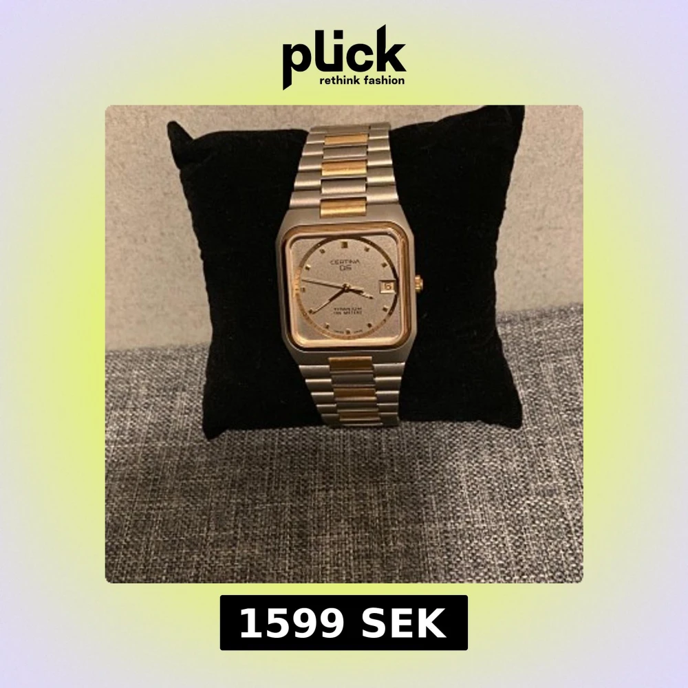 Elegant Certina DS herrklocka med en stilren design. Klockan har en fyrkantig urtavla i silver med guldiga detaljer och datumvisning. Armbandet är i rostfritt stål med guldiga inslag, vilket ger en lyxig känsla.