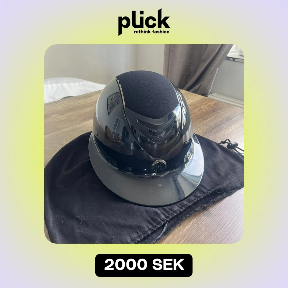 Snygg och stilren svart ridhjälm med glansig yta och matt tygdetalj på toppen. Perfekt för ridning och ger ett elegant intryck. Hjälmen ser ut att vara i mycket bra skick och kommer med en praktisk förvaringspåse.