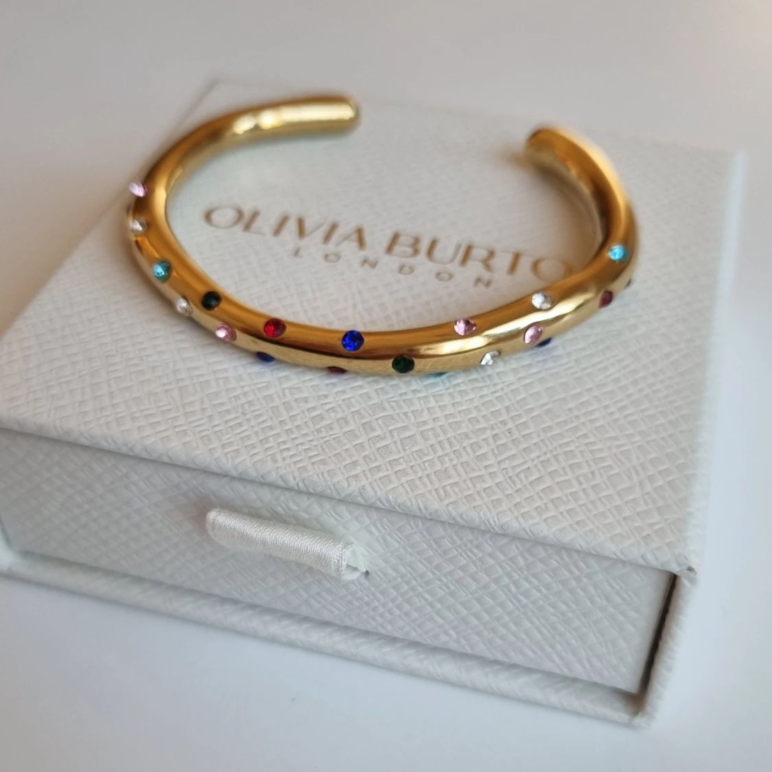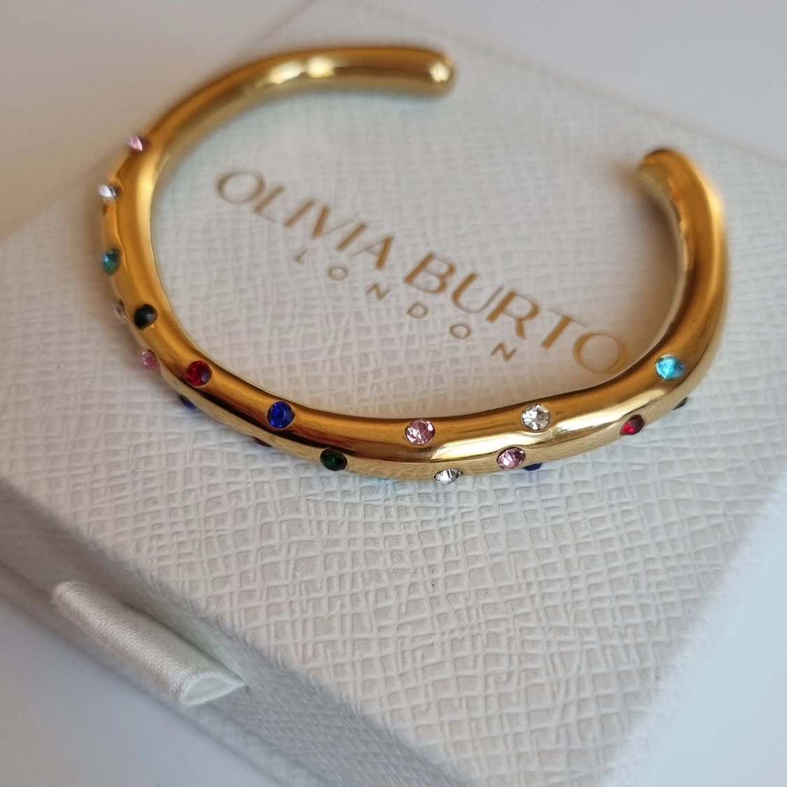 Stilrent guldfärgat armban med rundad form och dekorerat med små färgglada stenar i blått, rött, grönt, rosa och vitt. Perfekt statement-piece för dig som gillar färg och glittriga detaljer. Lådan ingår ej.