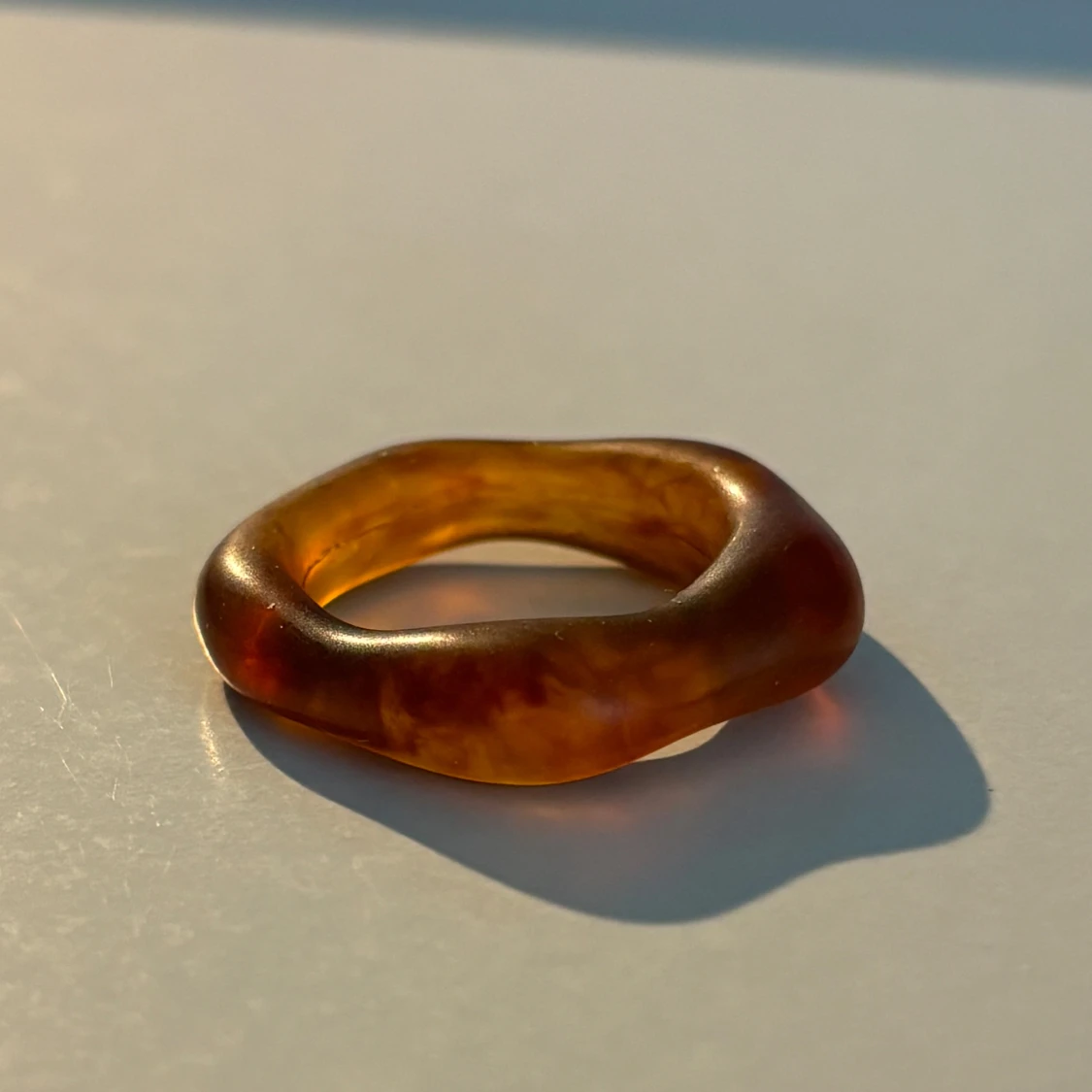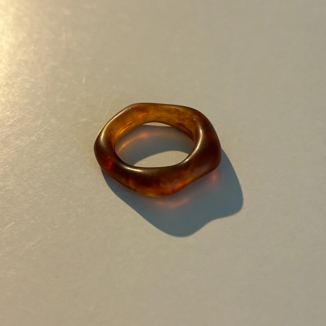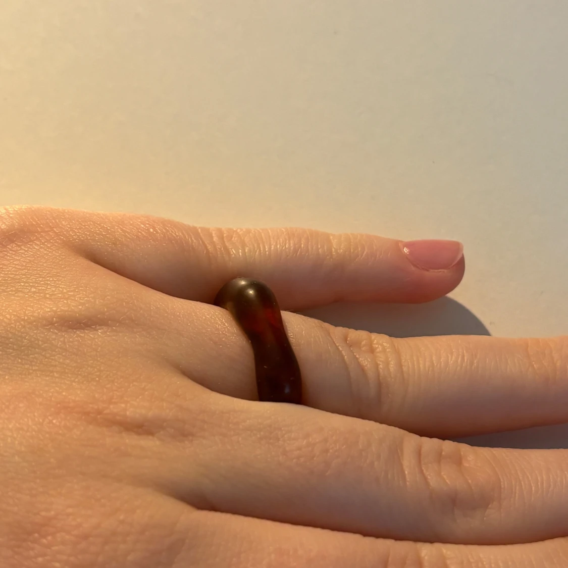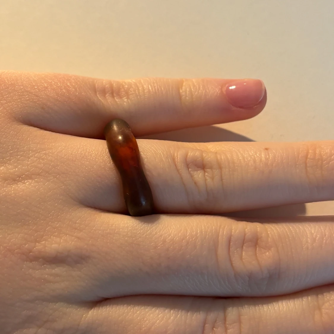 Säljer en unik brun ring i ett transparent material med en organisk form. Ringen har en mjuk och rundad design som ger ett naturligt och stilrent intryck. Perfekt för att ge en subtil touch till din stil.