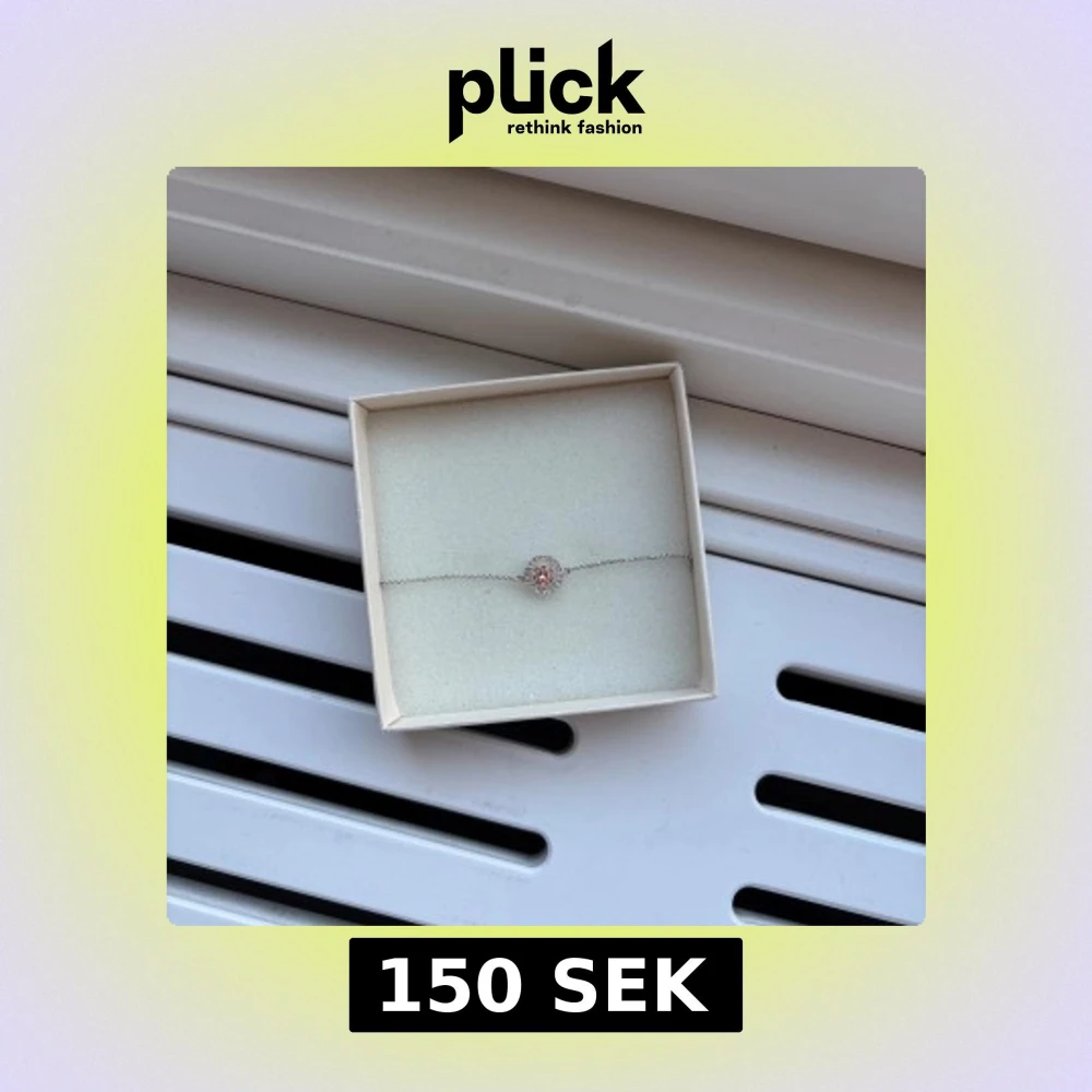 Elegant silverarmband med en gnistrande rosa sten i mitten, omgiven av små klara stenar. Armbandet har en tunn silver kedja och justerbart lås. Aldrig använt.