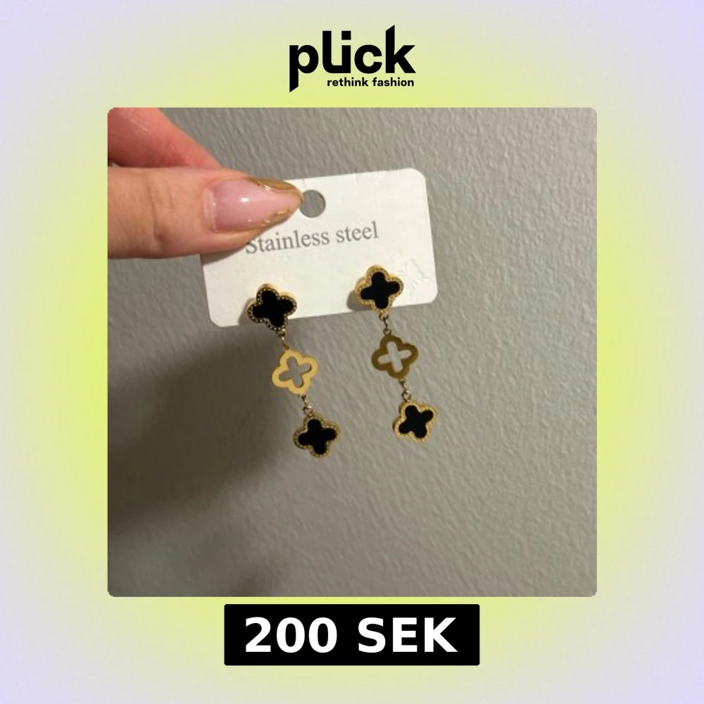 Eleganta örhängen i rostfritt stål med svart och guld detaljer. Designen har en klöverformad stil med två hängande delar som ger en stilren look.
