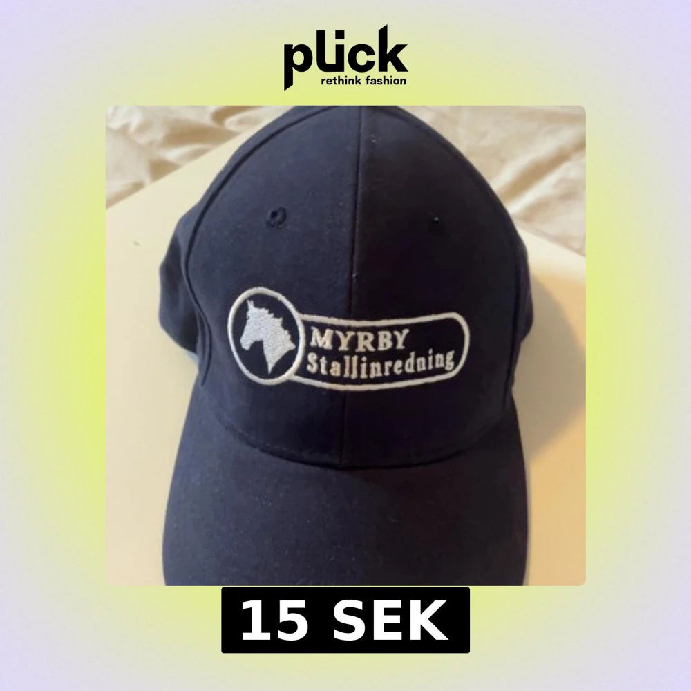 Snygg mörkblå keps med vit broderad häst och texten 'MYRBY Stallinredning' framtill. Klassisk böjd skärm och justerbar baktill. Perfekt för dig som gillar hästar och vill ha en stilren look.