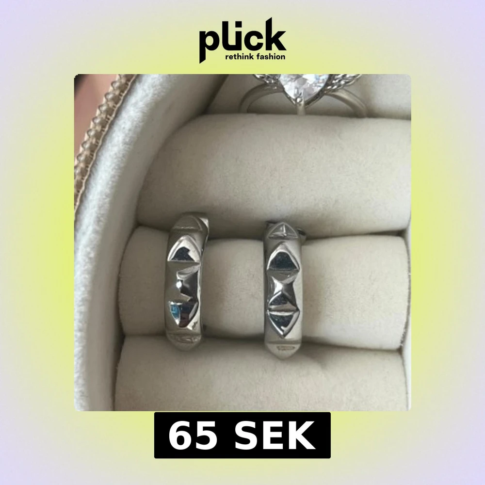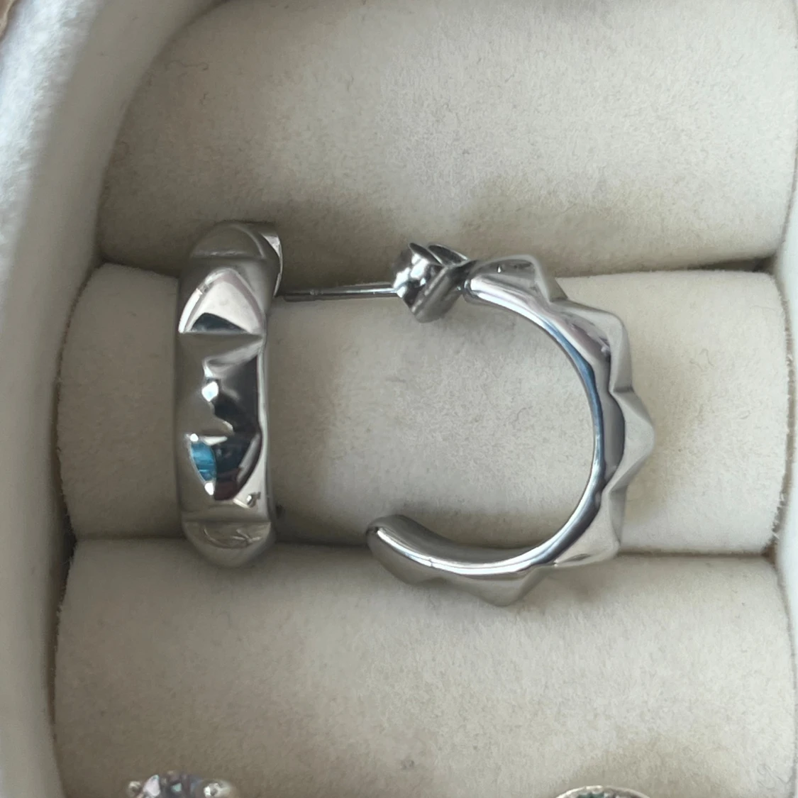 Säljer ett par chunky silvriga örhängen från Goddess med coola geometriska former på ytan. De är runda hoops med en unik, kantig design som verkligen sticker ut. Perfekta för dig som vill ha något annorlunda och trendigt i smyckeskrinet.