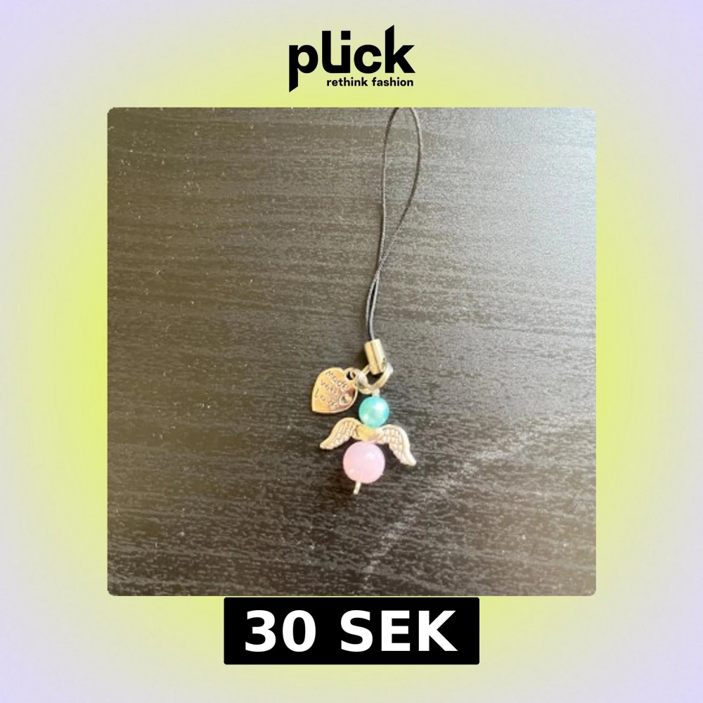 Sött mobilhänge med en ängel gjord av en rosa och en turkos pärla samt silvriga vingar. Hängsmycket har även en liten hjärtberlock med texten 'made with love'. Perfekt som accessoar till mobilen eller väskan.🩵