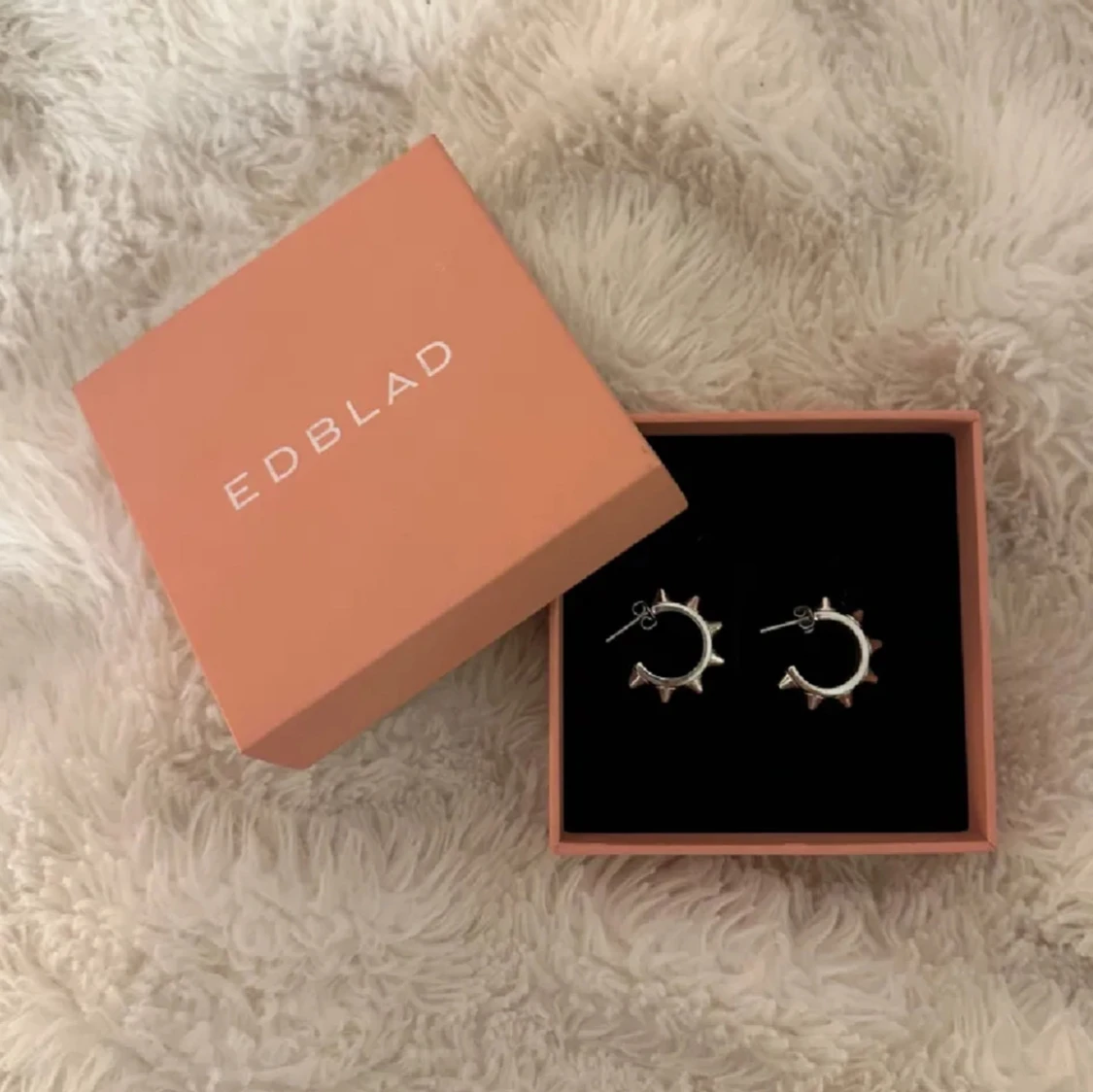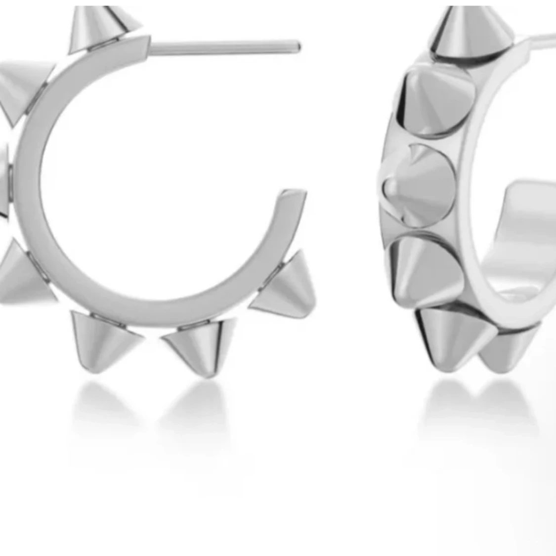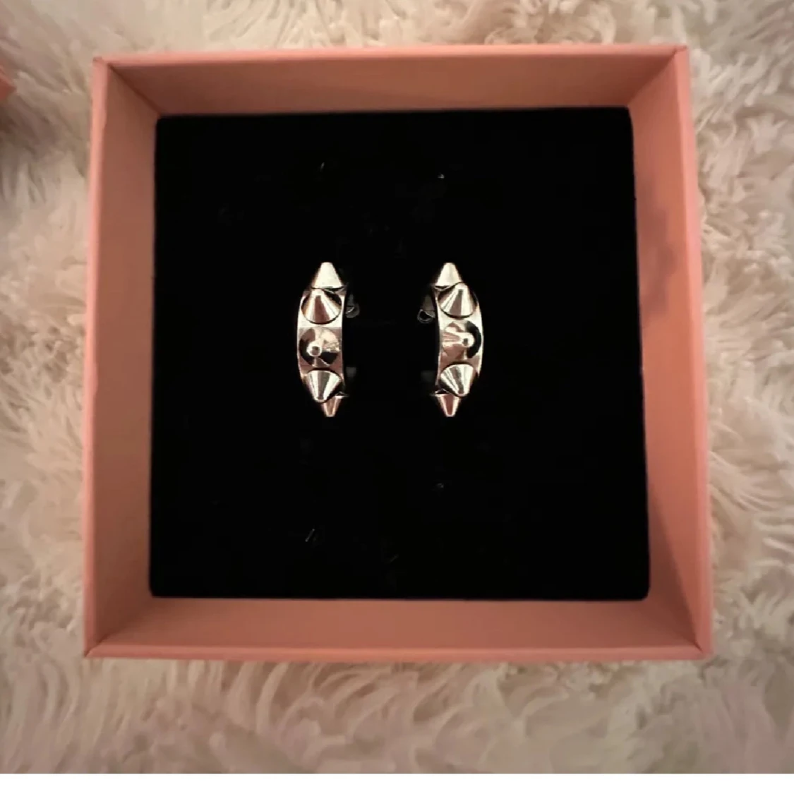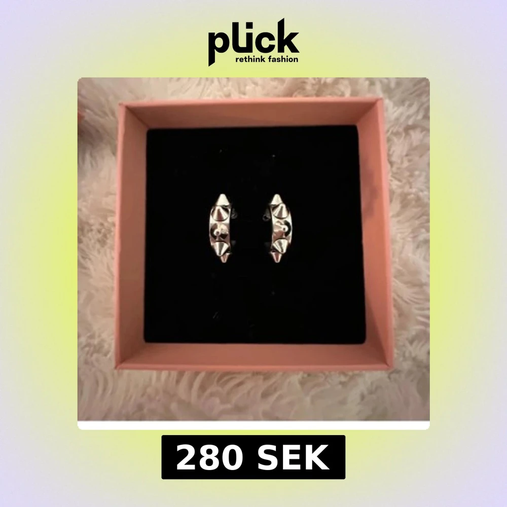 Coola silvriga örhängen i form av små ringar med spetsiga nitar. Använd få gångar. Mycket bra i skick som helt nya. Nypris 399