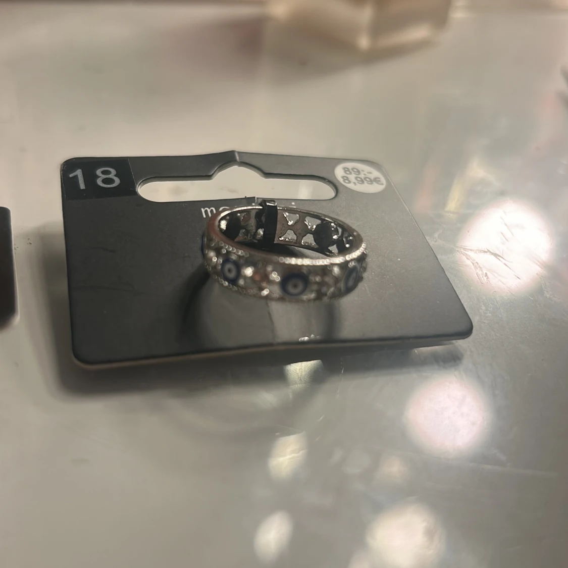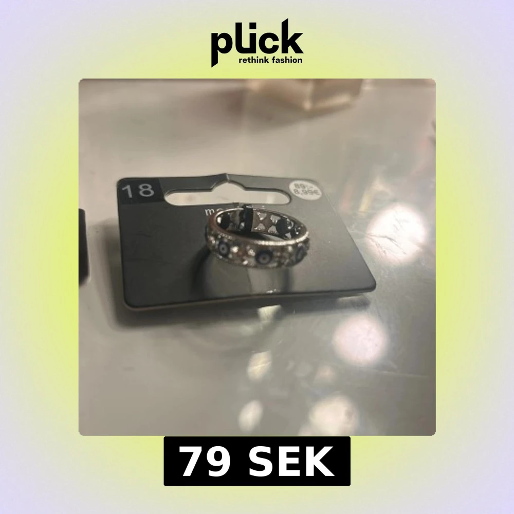 Cool silverfärgad ring från Montini med blå och vita evil eye-detaljer runt hela ringen. Ringen har en snygg glittrig finish och är perfekt för dig som vill sticka ut med en unik accessoar. Båda för 79