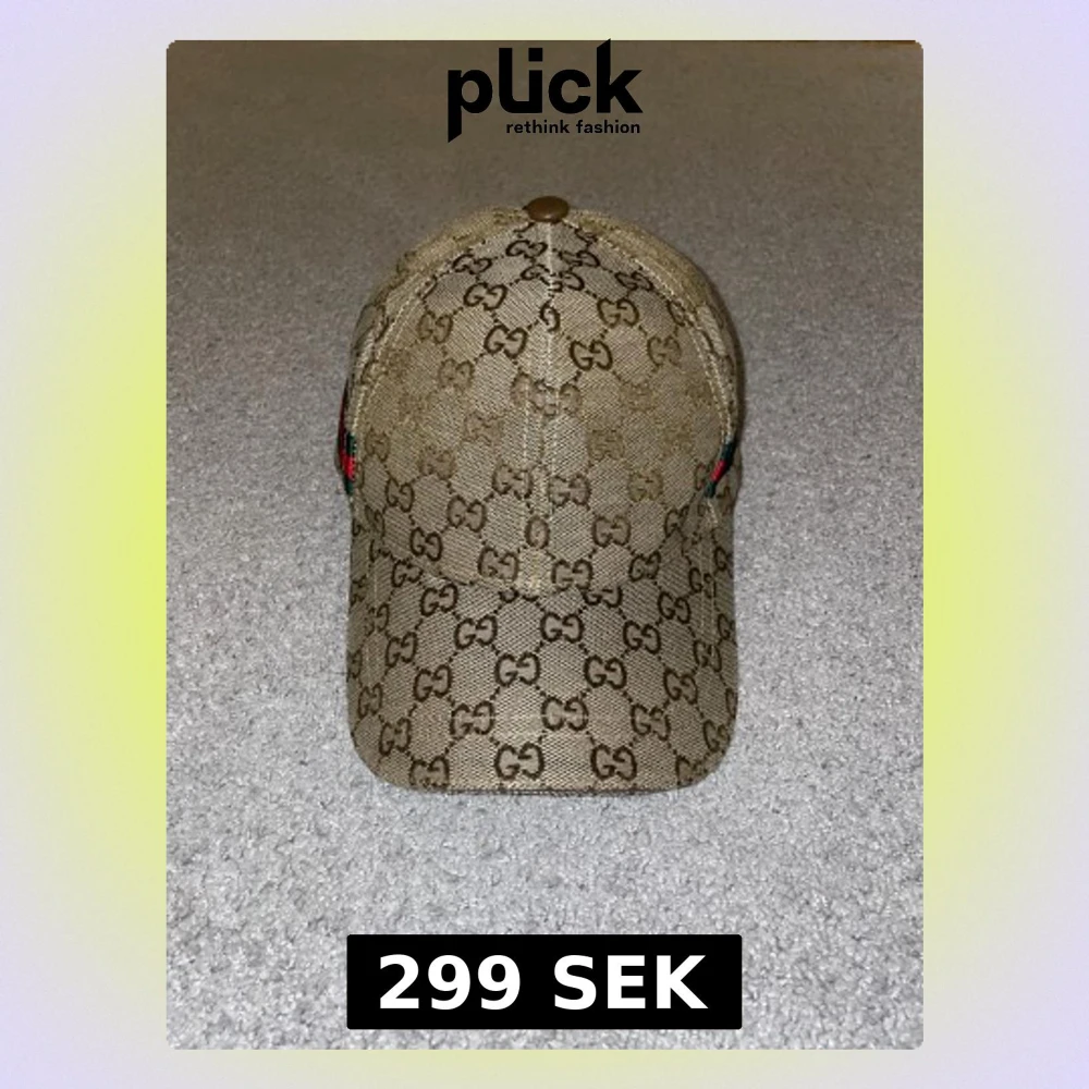 Snygg beige keps från med klassiskt GG-mönster över hela kepsen. Har en grön och röd rand på sidan och justerbar rem i brunt skinn baktill. Materialet är bomull och polyester, insidan är svart med loggor. Perfekt för dig som vill ha en lyxig streetstyle.