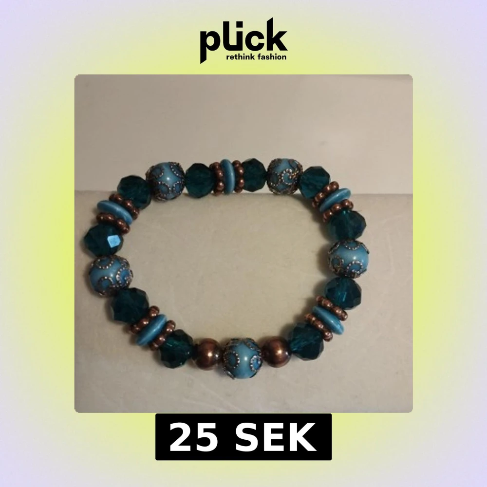 Snyggt armband med turkosa och mörkblåa plastpärlor. Armbandet har detaljer i bronsfärg och är elastiskt för enkel passform. Perfekt för att ge en färgklick till din outfit! Armbandet är 6 cm i diameter och omkretsen är 16 cm.