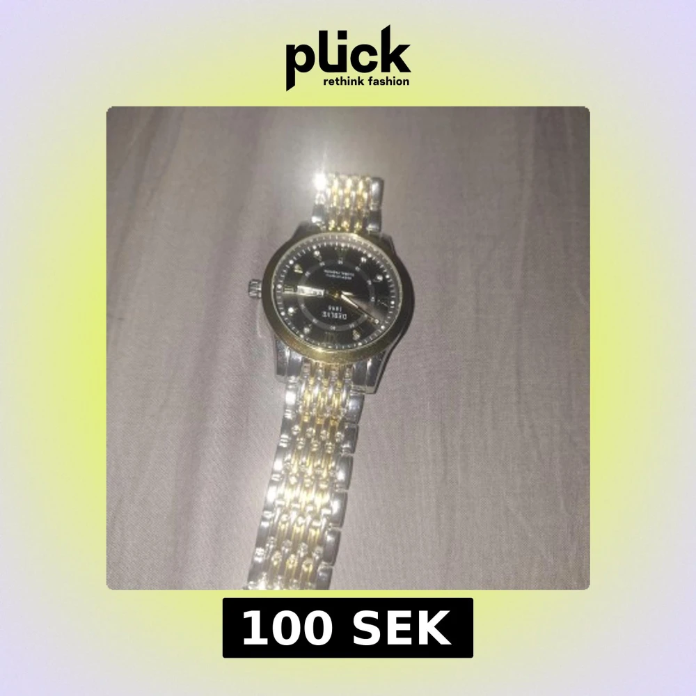 Elegant klocka med en kombination av guld och silver i armbandet och en svart urtavla. Klockan har en klassisk design med tydliga markeringar och datumvisning. Perfekt för den som vill ha en stilren accessoar.