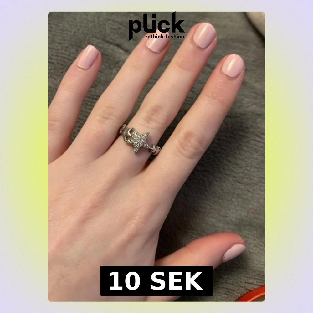 Unik silverfärgad ring med en gnistrande stjärna och måne dekorerad med små klara stenar. Ringen har en öppen design och är justerbar i storlek. Perfekt för dig som gillar detaljer och vill ha något som sticker ut.Vid köp av fler ringar kan jag slå ihop annonserna så frakten blir billigare.