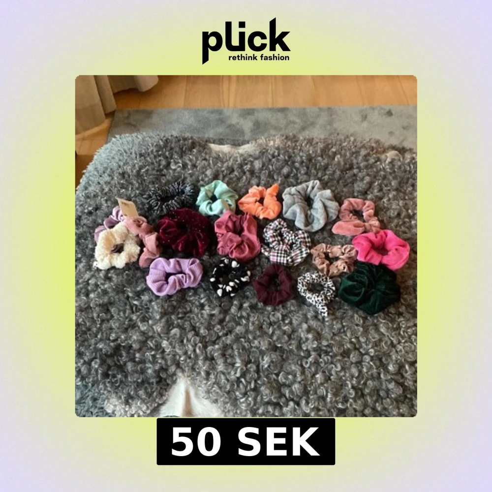 Säljer ett set med scrunchies i flera färger och material, inklusive sammet, fuskpäls och bomull. Färgerna varierar från rosa, lila, grön, svart, vit till mönstrade varianter som rutig och leopard. Perfekt accessoar för håret!