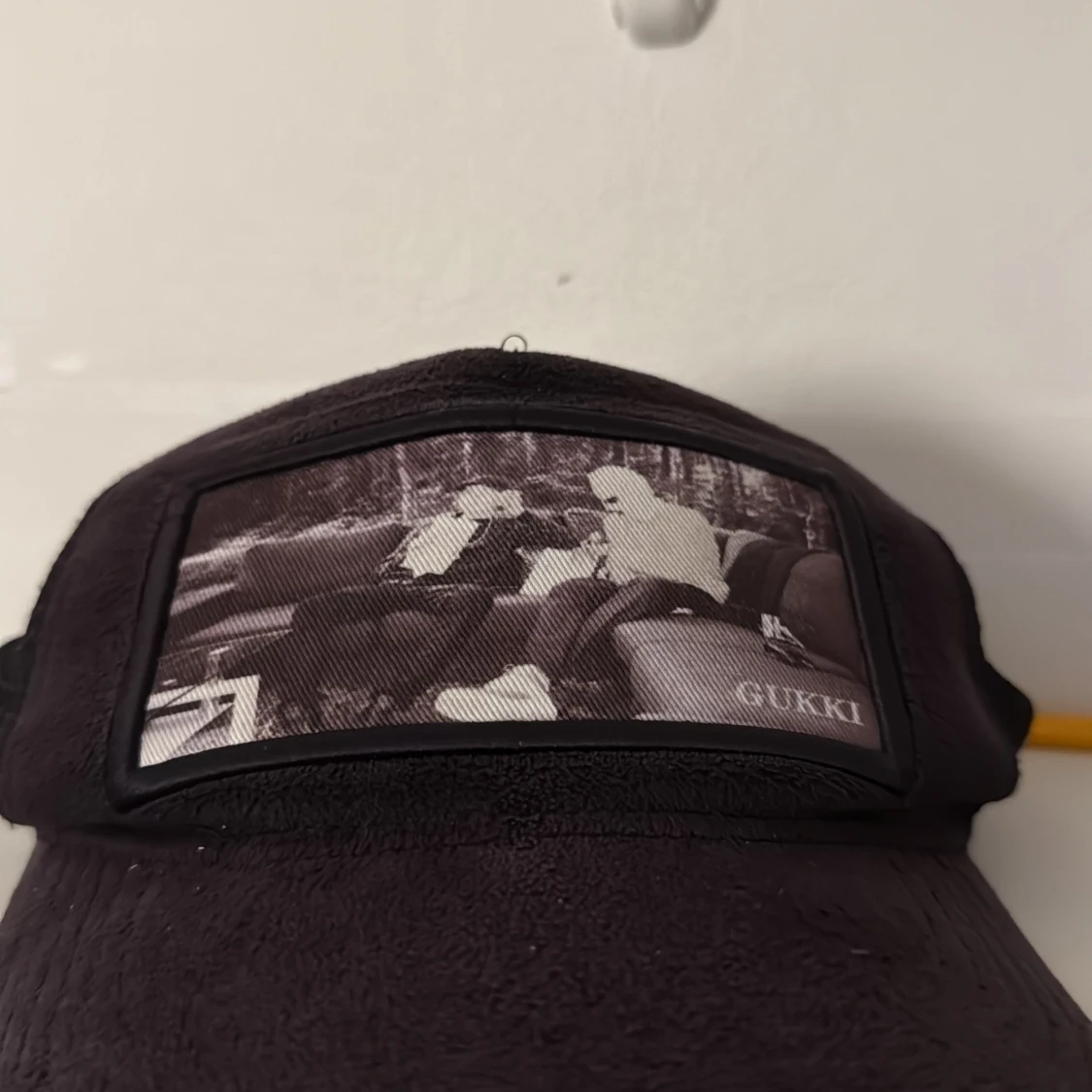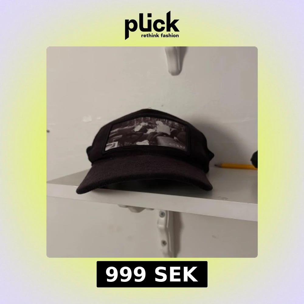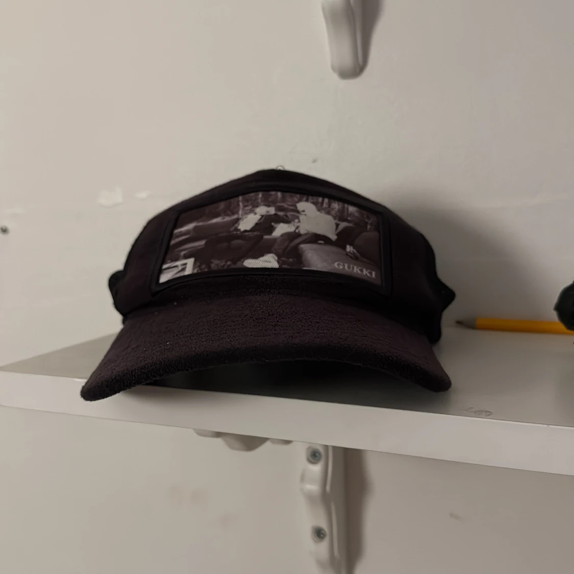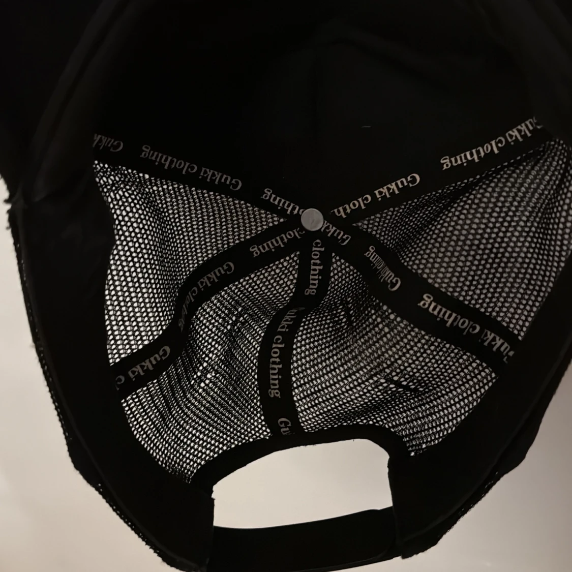 Svart keps med böjd skärm och mesh på sidorna för extra ventilation. Framtill finns en svartvit patch med motiv av personer som chillar på soffor och texten 'GUKKI'. Justerbar baktill för perfekt passform. Snygg och streetinspirerad stil.