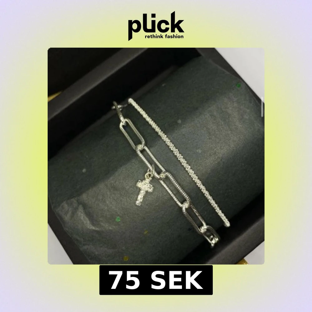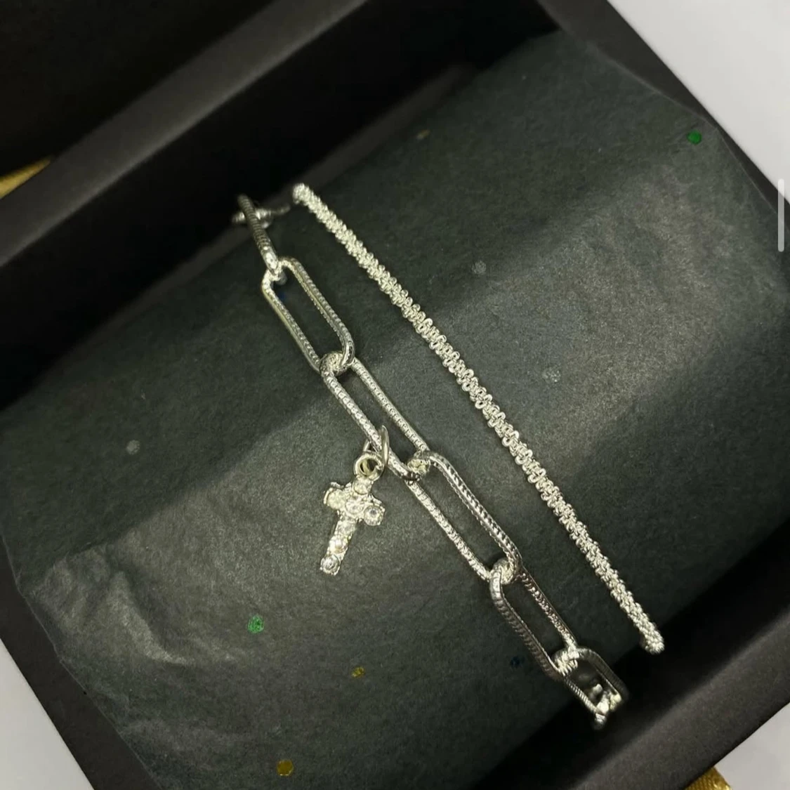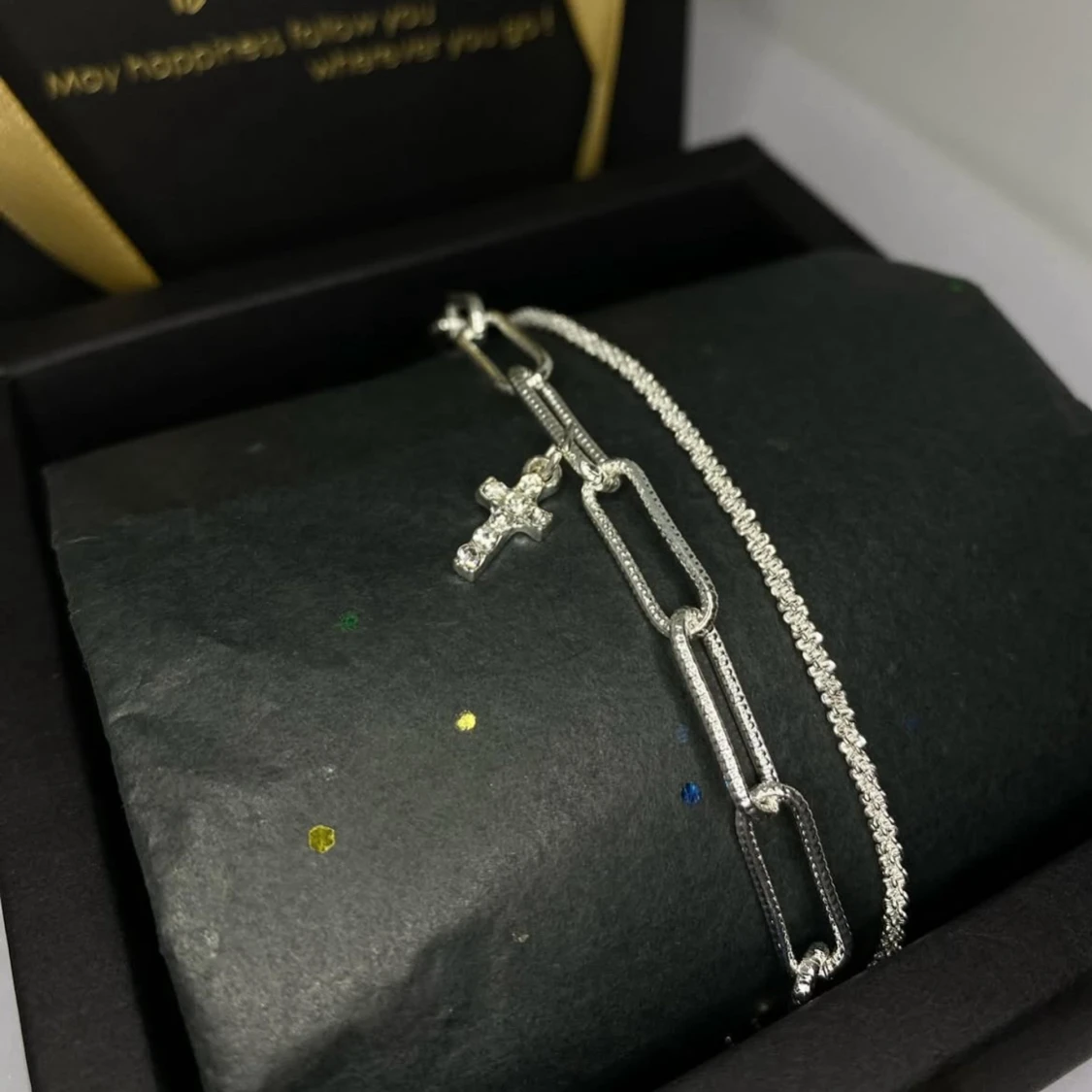 Två stilrena silverarmband, ett med glittrande korsberlock och stora kedjelänkar, det andra med tunn, glittrig kedja. Ej använd utan kommer från min small business.