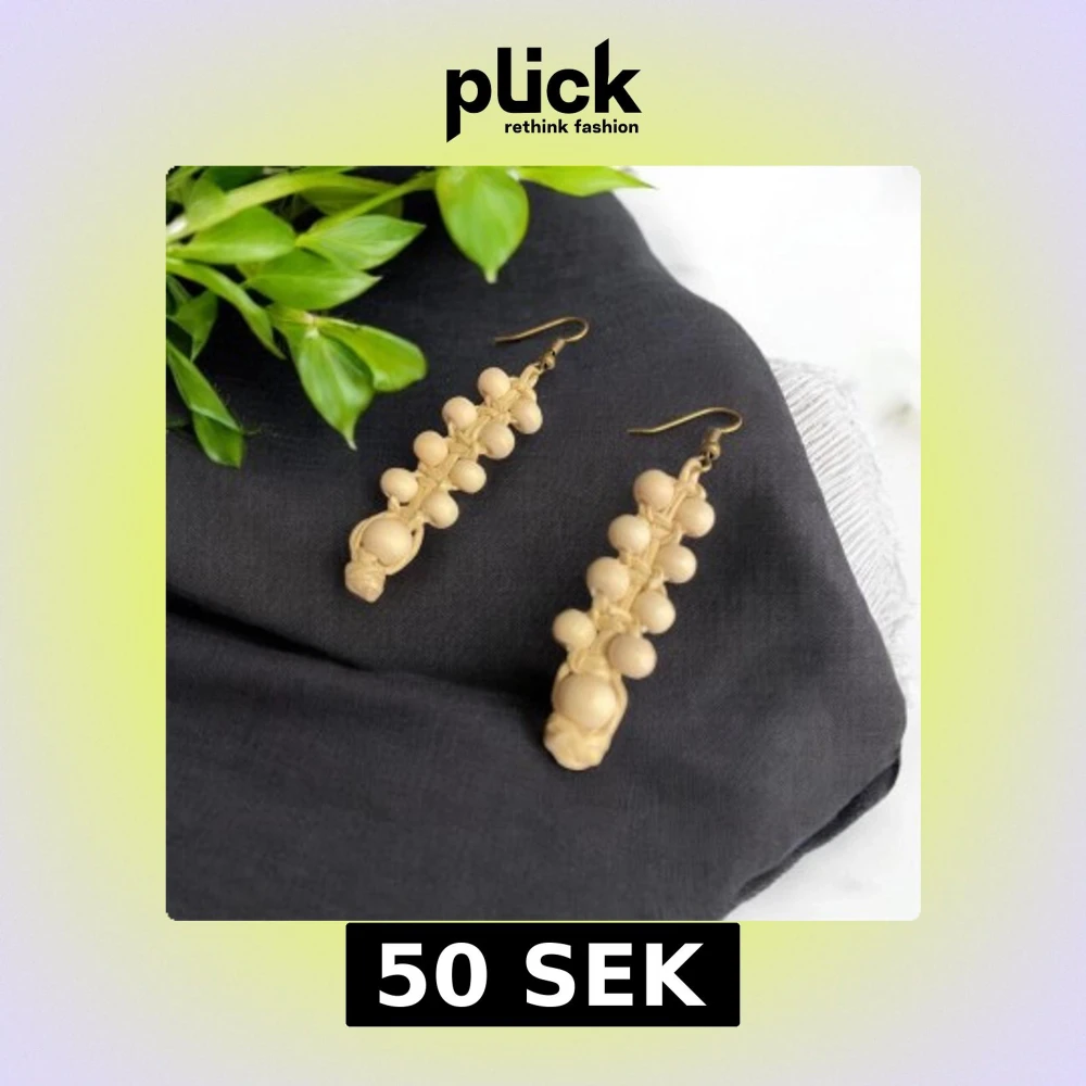 Eleganta beige örhängen med flera runda pärlor i rad. De har en krok för enkel användning och ger en stilren look. Perfekta för att lägga till en touch av elegans till din outfit.