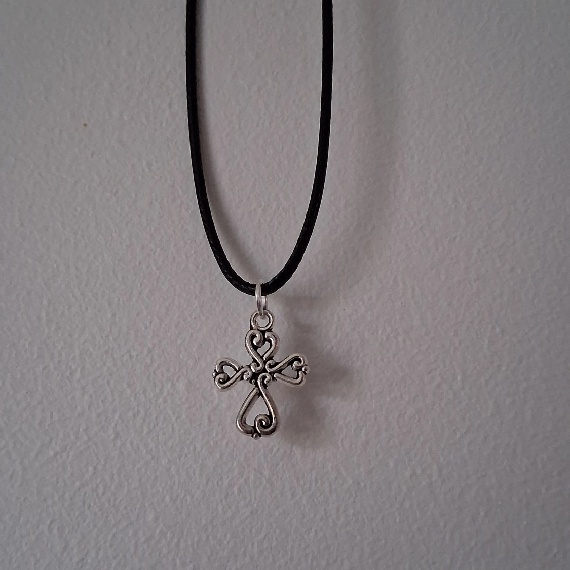 Snyggt halsband med ett dekorativt korshänge i silverfärg. Hänget har en intrikat design med snirkliga detaljer och hänger på en svart rem. Perfekt för att ge en stilfull touch till din outfit.