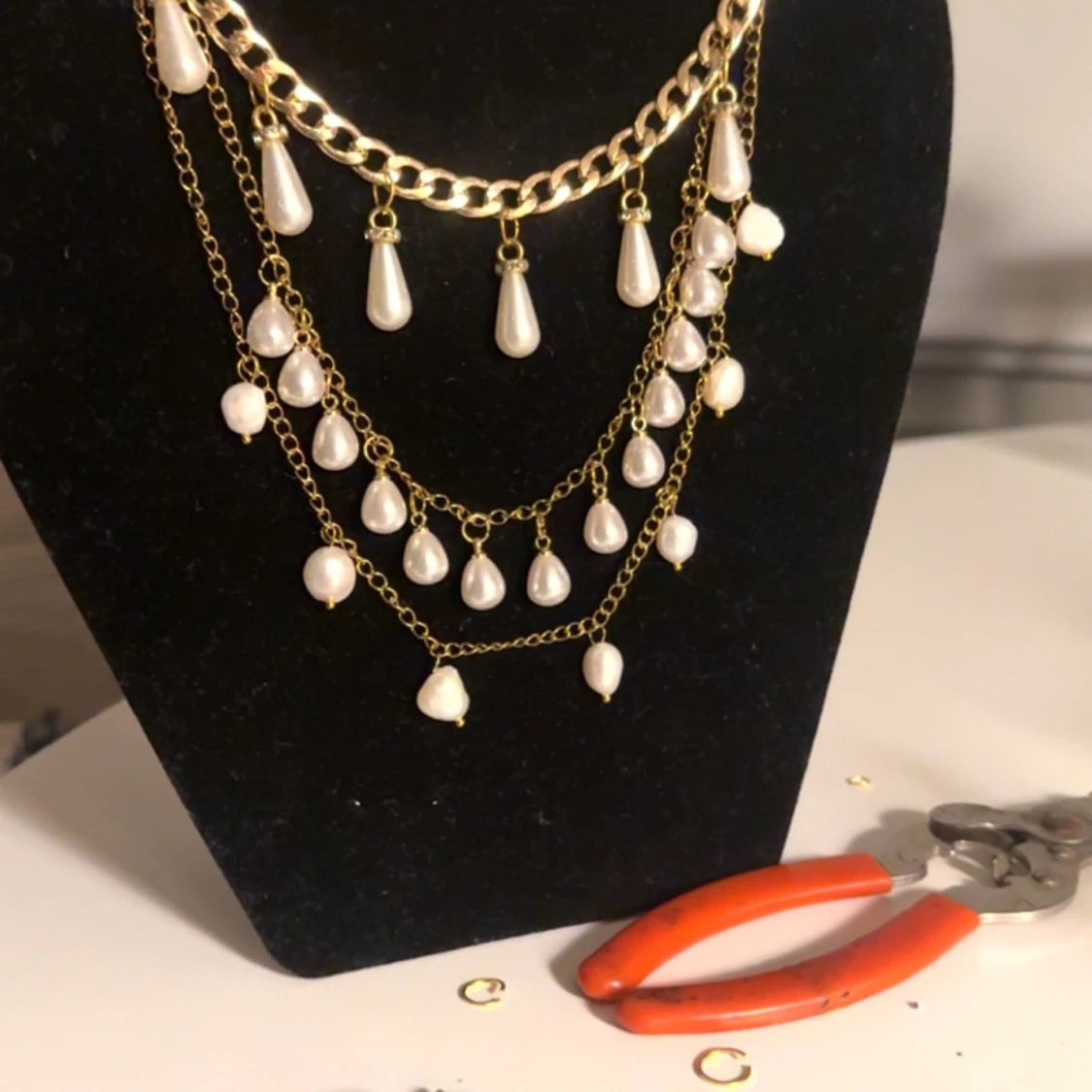 Första halvplan det kostar Unikt halsband 500 andra kostar 2000 och sista kostar 250 Och det sittas är sötvattenspärlor i guldton med flera lager kedjor och hängande vita pärldroppar. Kedjorna har olika tjocklek och pärlorna är både runda och droppformade, vilket ger en cool och lyxig vibe. Perfekt för att lyfta din outfit med lite extra bling.
