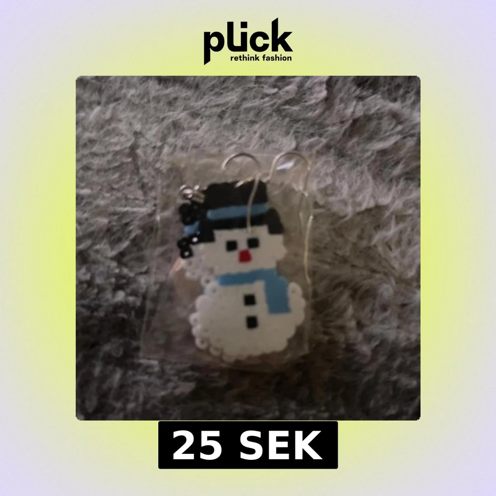 Unika örhängen med snögubbe gjord av pärlplattor. Snögubben har svart hatt, blå halsduk och röda detaljer. Perfekt accessoar för vintern och julen om du vill sticka ut med något lekfullt och kreativt.